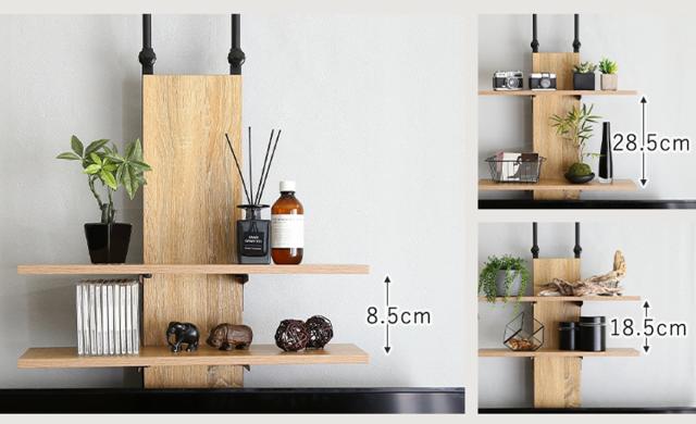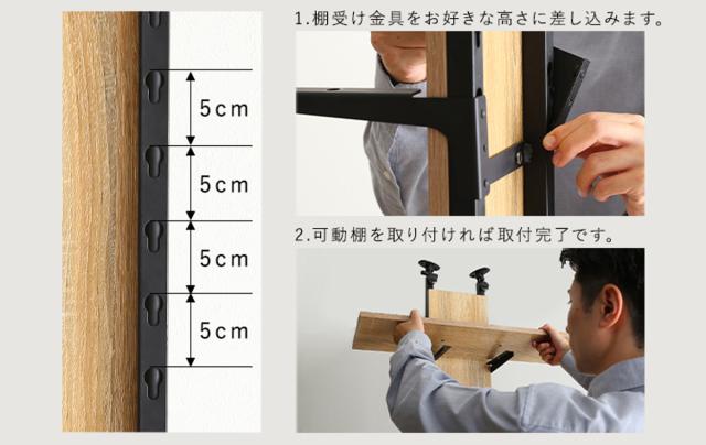 棚は、棚受けをお好きな高さに差し込んで、棚板を取り付けるだけで簡単に付け替えができます。テレビ上とテレビ下の棚どちらとも、置きたい物の高さに合わせて5cmピッチで調節していただけます。
