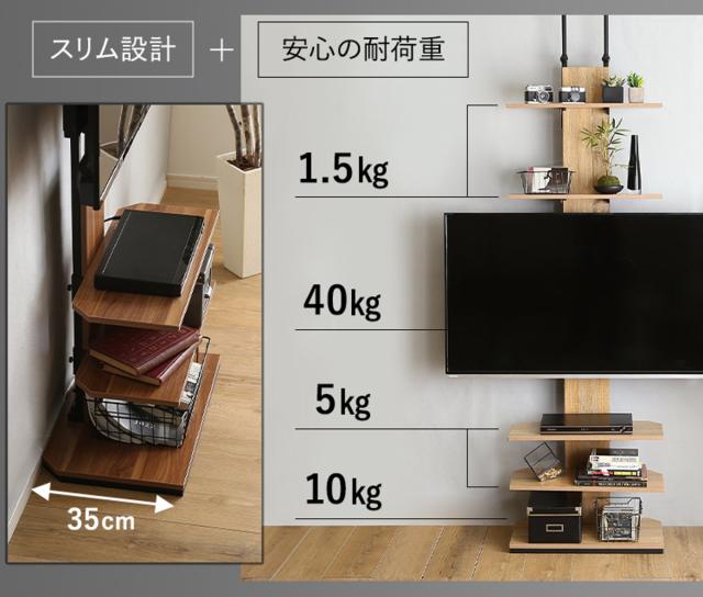 圧迫感を感じにくいスリムな奥行です。お部屋をすっきりと、生活導線も広く取っていただけます。スリムでありながらしっかりと突っ張ってくれるので、耐荷重も十分、40kg以下(32〜60インチ)のテレビを安心して取り付けできます。