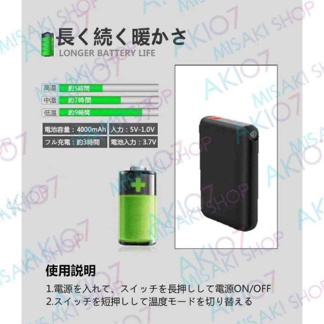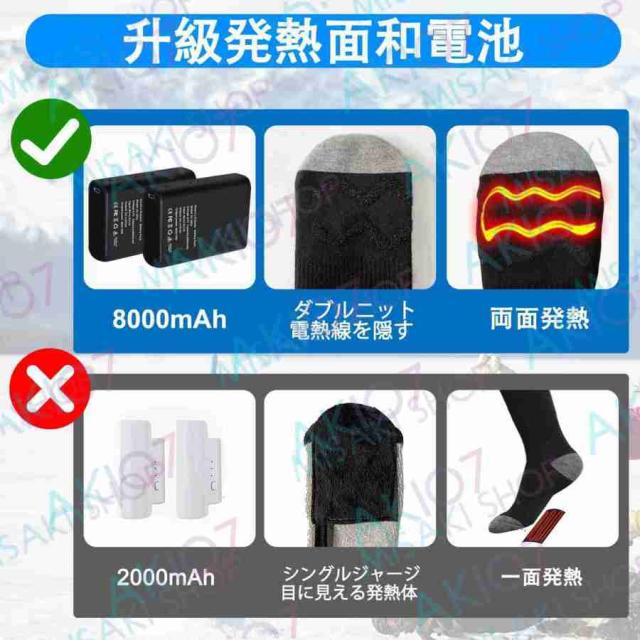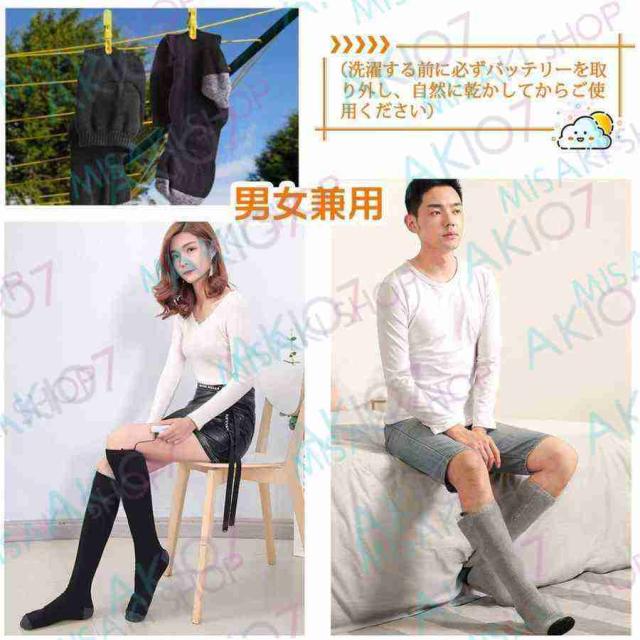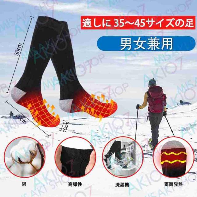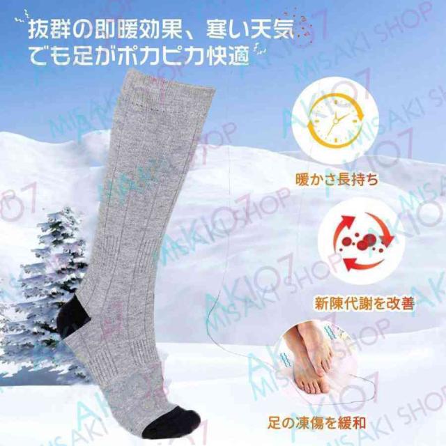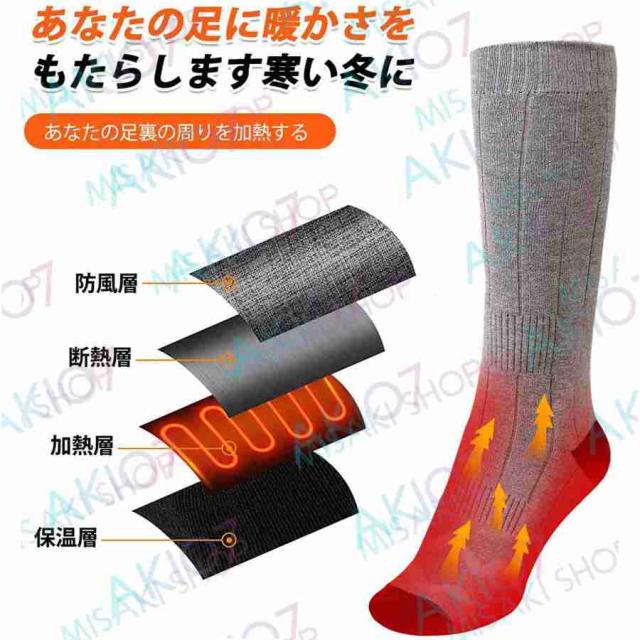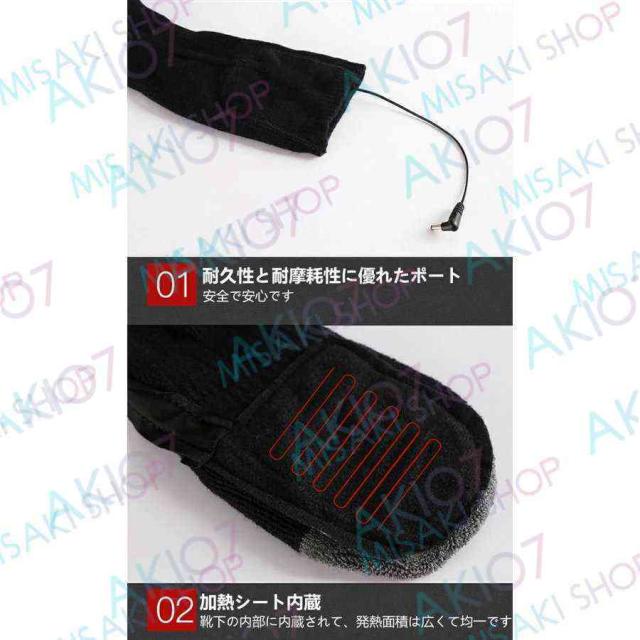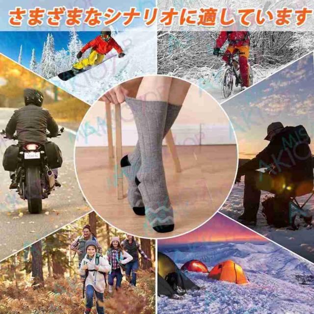 *【防寒対策&暖かくなる】電熱ソックスの底部には赤外線炭素繊維電熱ヒーターが内蔵されて。高品質で安全な充電式ヒーターがつま先全体を覆っています。5秒でヒーターの周りが暖かくなり、電熱ヒーターで直接に温めるので暖房効果が高いです。底冷えから足を温めることで、全身の冷え予防になります。また、血液循環を改善し、寒い季節に足がひび割れたり傷ついたりするのを防ぎます。*【3段階に温度調節可能】この電熱靴下は三つの加熱セットがあり、?単に調節できます。光るヒートスイッチで(高温:3つの青いライトが点灯します;中温2つの青いライトが点灯します;低温1つの青いライトが点灯します。)の3段階温度を調節でき。3段階調整モードで、さまざまな環境の下で自由に適切な温度を選択することができますが、それは靴下の使用時間を延長するのに役立ちます。*【3.7V 4000mAh充電式リチウムバッテリー】加熱ソックスは二本の充電式リチウムバッテリーを内蔵されて、充電時間が約3~4時間です。加熱ソックスは最低の設定で約9時間、中程度の設定で約6時間、最高の設定で約3時間持続します。暖かさ長持ち、長時間の移動時や、デスクワークなどに最適です。そして、手洗いにも洗濯機にもOK、長くお使い頂けます。*【着心地いい超高品質電熱靴下】この加熱ソックスは82%綿、8%ポリエステ10%弾性素材を採用しており、優れた防寒保温性能を実現しながら、吸収性、通気性、速乾性、伸縮性を備えます。耐久性が抜群、履き心地が快適な加熱靴下です。足先の寒さ対策とした靴下は靴下の底部にヒーターを内蔵したことで底冷えから足を温めることで、全身の冷え予防になります。加熱機能を使用しない場合は、普通の靴下としても適合します。*【最高の贈り物、快適な冬を過ごす】日常生活、通学通勤などの日常的な用途だけでなく、スキー、スノーボード、釣り、ジョギング、狩り、サイクリング、ハイキング、登山などのアウトドアスポーツにも大活躍です。お年上の方に贈るだけではなく、ご家族や恋人、友たちにも素敵なプレゼントです。フリーサイズで、男女兼用です。