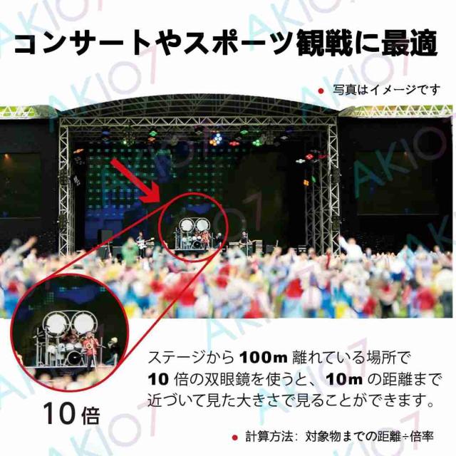 光学倍率をコンサートシーンで使える10倍を維持したまま、光の透過率をできるだけ上げることのできるレンズを採用。薄暗い場所でも明快なブルーレイ画質を見える可能。10倍の倍率で、100m先の人を裸眼で10m先から見るのと同じ大きさで見えます。目の前に臨場感を見逃さないように。