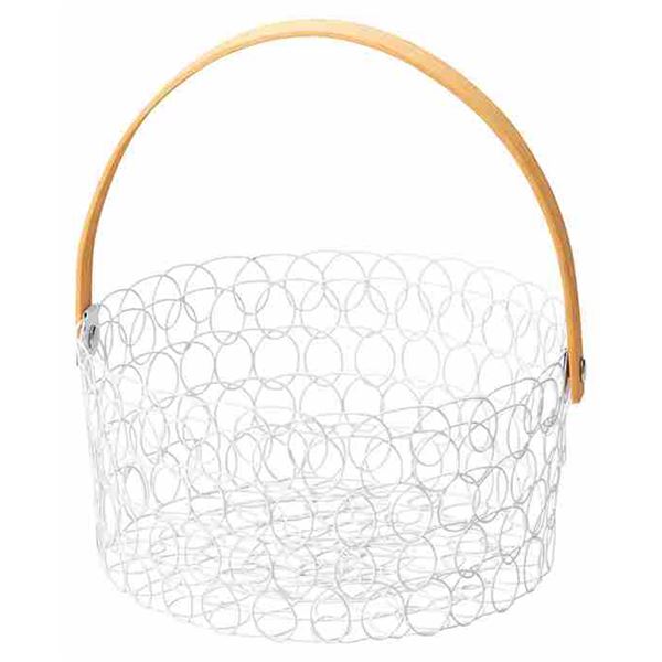 取っ手付きのワイヤーバスケット。卓上の小物の収納や、インテリアに。ギフトラッピングの土台としても使える。