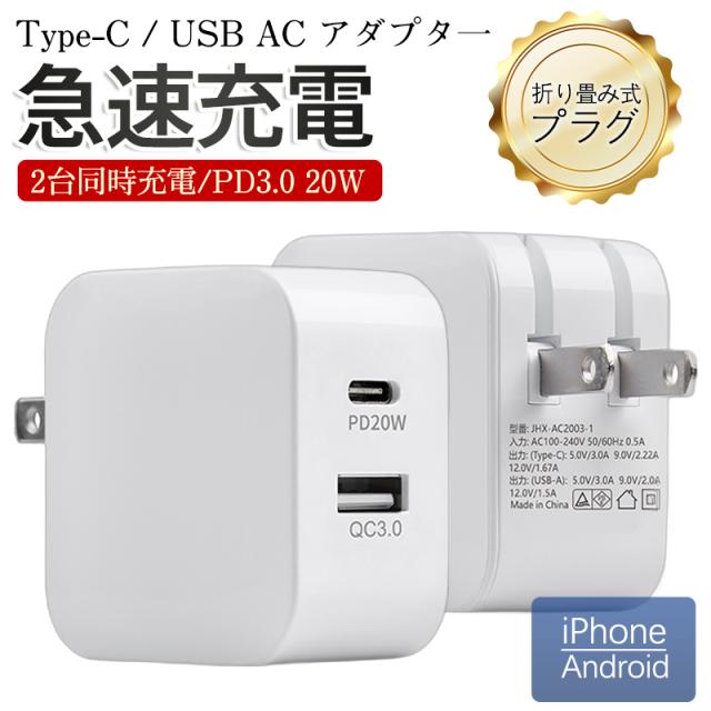 【即日発送】 ACアダプター スマホ充電器 PD iPhone QC3.0 USB 急速充電器 20w Type-c 2ポート チャージャー 高