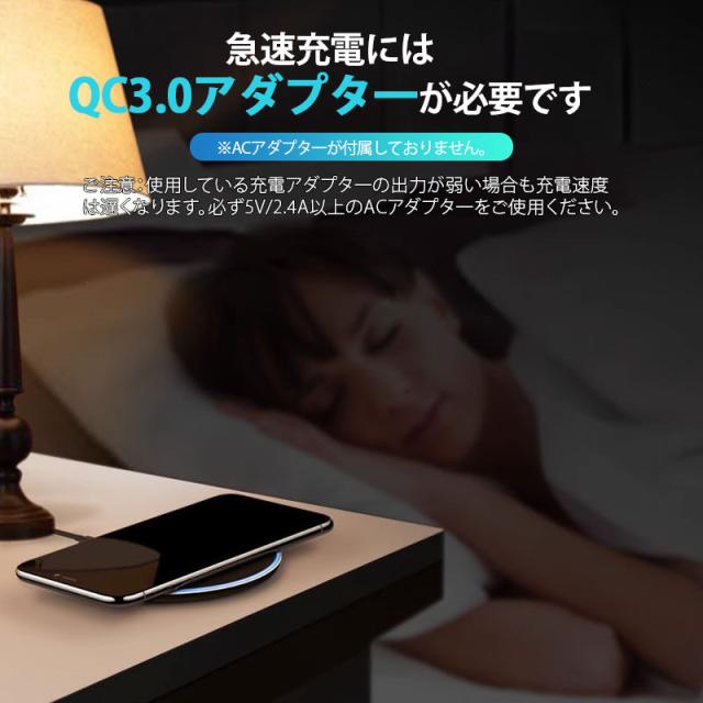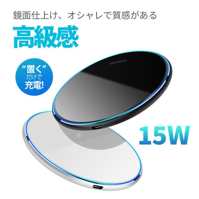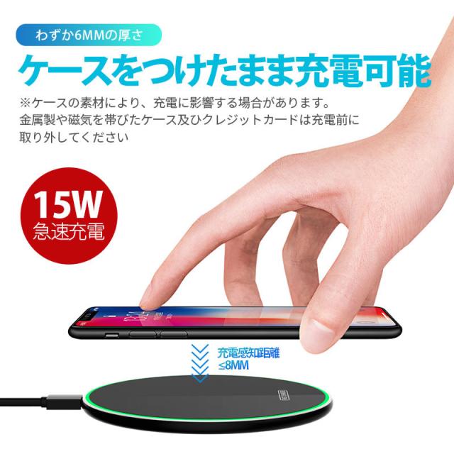 「15W高速充電」、「置くだけ充電」、「ケースをつけたままで充電」、Qi規格準拠のワイヤレス充電器。