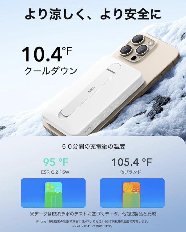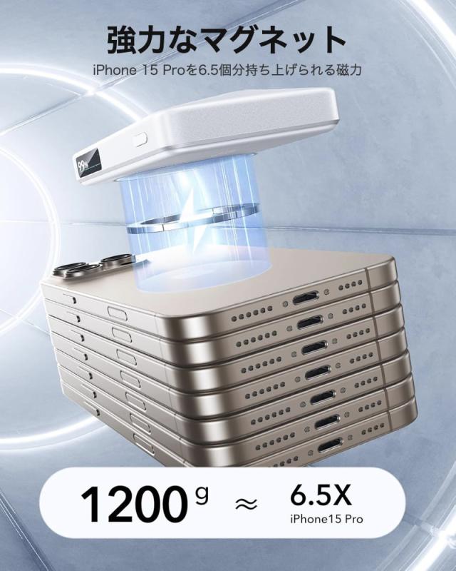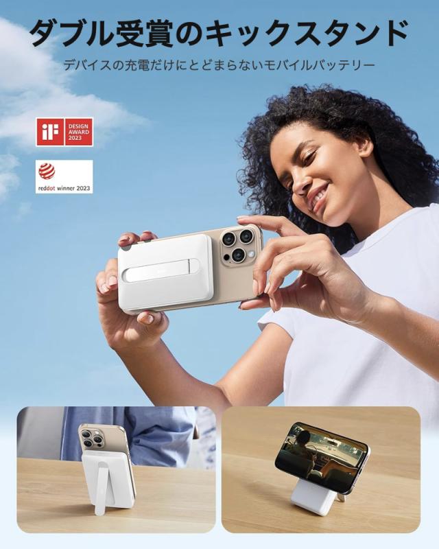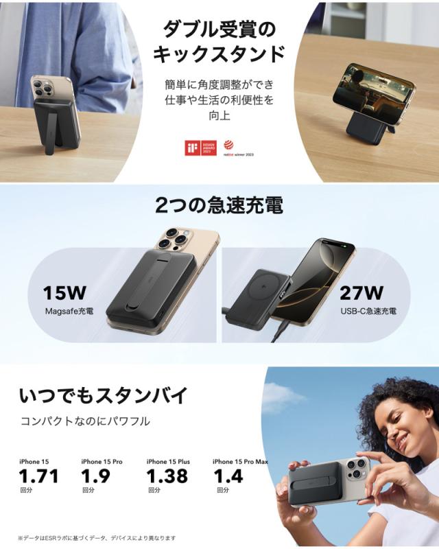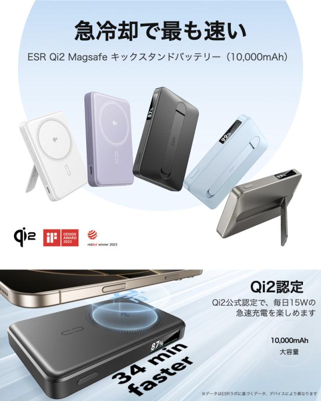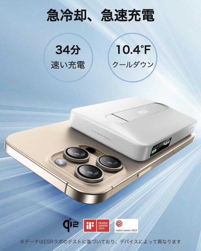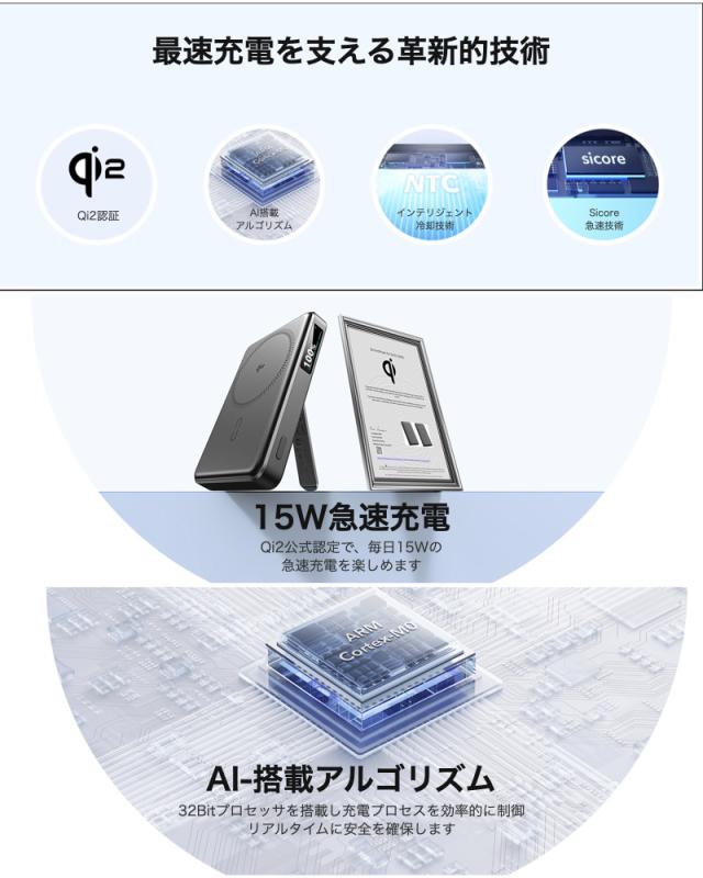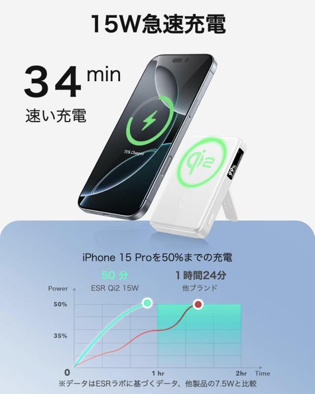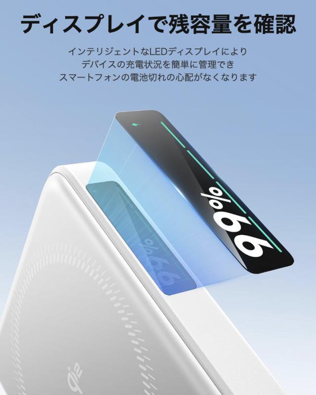 【Qi2認証の急速充電】Qi2認証の15W MagSafe対応充電器は、7.5W充電器より2倍速く、より安全で、より速く、より信頼性の高い充電を可能にします。【ダブル受賞デザイン・スマートディスプレイ内蔵】IF賞とレッドドット賞を受賞したこの革新的な折りたたみ式のデザインは、45°〜70°間で角度調整が行え、快適角度でスマホ使用が行えます。また、充電状況とリアルタイムのバッテリー状態を確認できるスマートLEDディスプレイを備えています。【放熱機能】内蔵されたNTCセンサー、AIアルゴリズム、グラフェン放熱が充電状況を監視し、過充電や過熱を防止し、安全にデバイス保護を行います。また、機内持ち込みも対応しています。【強力マグネットロック】1,200gの磁力でモバイルバッテリーをしっかりと固定します。【2台同時充電】Qi2 MagSafeワイヤレス充電とUSB-C有線充電で2台のデバイスを同時に充電です。 ワイヤレス充電はiPhone 15/14/13/12シリーズのみ対応。 同梱品:Qi2ポータブル充電器、0.6m USB-C - USB-Cケーブル、取扱説明書。