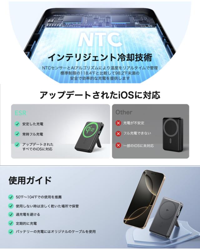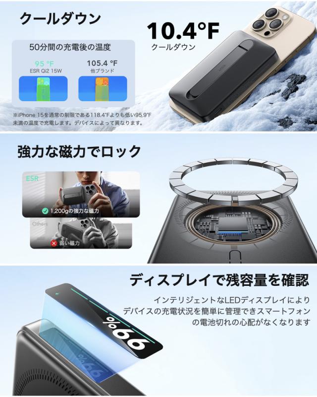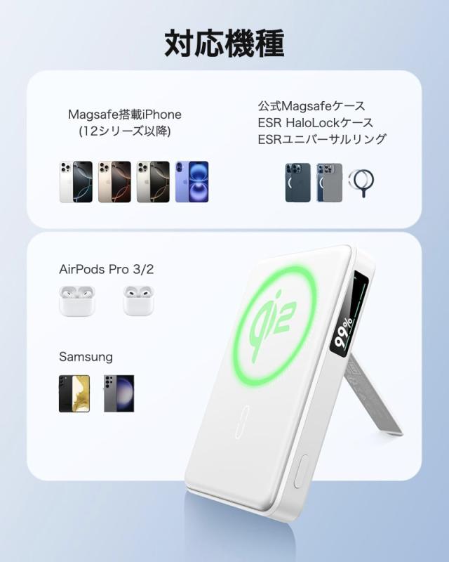 | ESR モバイルバッテリー | 【瞬間充電】 スマホが充電器に吸着するとすぐに、MagSafeワイヤレス充電が自動的に開始。より速く、より便利なワイヤレス充電を実現。 【便利なキックスタンド】 調整可能な内蔵キックスタンドにより、外出先での閲覧やFaceTime時にスタンドに変身。 【一日充電可能】 10,000mAh の大容量で、iPhone 14を1.7回充電可能。7.5W のワイヤレス充電または20Wの有線充電により高速充電を実現。 【強力磁気吸着】 1,000 gの吸着力を持つ強力な磁石により、充電中もワイヤレス充電器がスマホにしっかりと固定。 【使いながら充電】 便利な位置にある側面のUSB-C ポートとパススルー充電により、スマホと充電器を同時に充電できるため、FaceTime中もスマホの充電が可能。iPhone 16/15/14/13 /12シリーズを近づくだけで背面に引き込まれ、直接充電することができます。ケースご使用になる場合はMagsafe対応ケースである必要があります。※マグネット式ワイヤレス充電はiPhone 15/ 14/13 / 12シリーズ以外には対応していません。充電を起動するためには、まずモバイルバッテリー側面の電源ボタンを押してください。 |