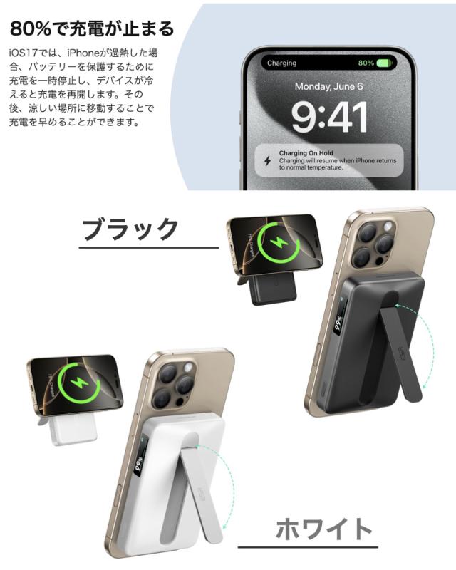 ESR モバイルバッテリー Magsafe 大容量 10,000mAh マグネット式ワイヤレス充電 7.5W HaloLock マグセーフ モバイルバッテリー 小型 キックスタンド マグネット式充電器 iPhone15/15Plus/15Pro/15Pro MaxとiPhone16/1514/13/12シリーズ対応