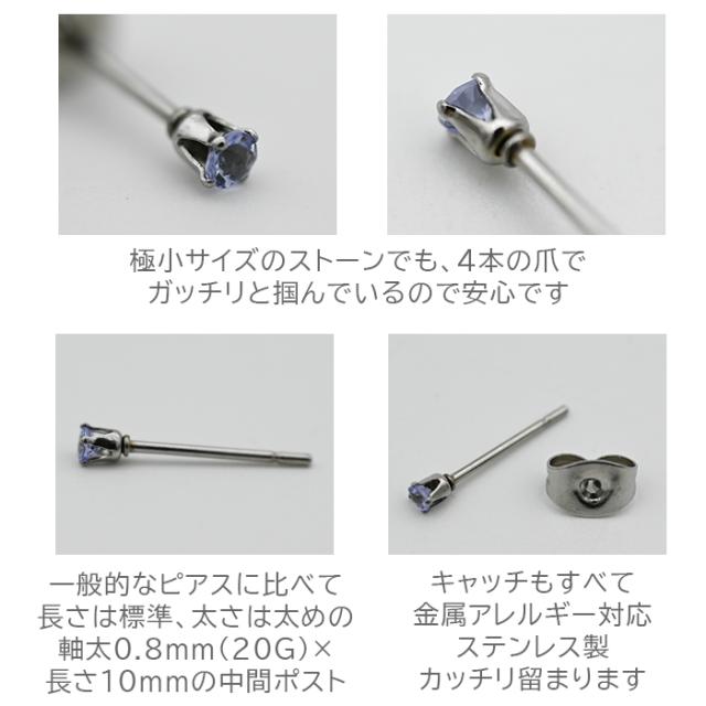 セカンドピアス つけっぱなし ピアス 極小 天然石 2mm 一粒 軸太 金属アレルギー対応 ステンレス 医療用 サージカル アクアマリン ブルームーン タンザナイト ピンクトルマリン 片耳 1個