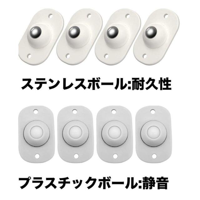 テープ式キャスターはビーズのデザインので、360度方向に移動できます。ビーズがプラスチック材質ので、ステンレスビーズと比べて、ノイズなしスムーズに移動できます。最大耐荷重は約10kg(四つ使用時)