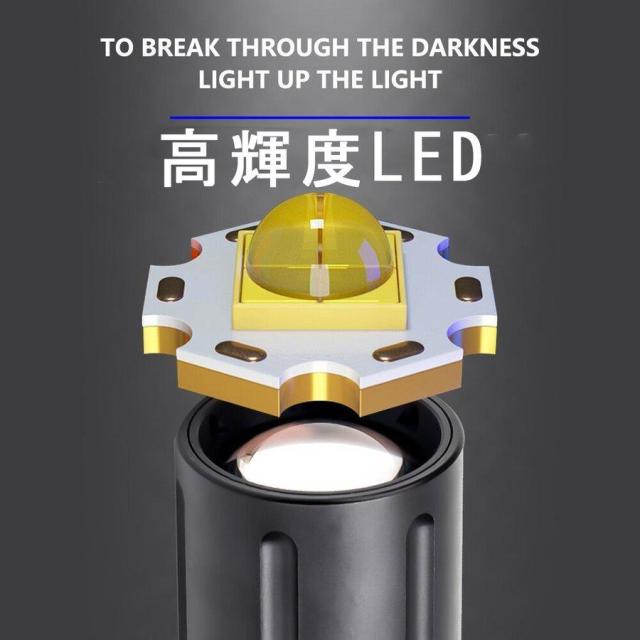 LEDランプビーズが使用され、最も強い出力輝度は10000ルーメンで、すぐに明るくなります。 車のヘッドライトに匹敵します。 広い範囲の照明、500メートルまでの長い範囲の照明、ボディは軍用航空グレードのアルミ合金材料を使用しています。 懐中電灯のヘッドには、LEDとガラスレンズを損傷から効果的に保護することができるステンレス製のアタックヘッドがより密接に装備されています。 停電中に手を解放して照明できます。