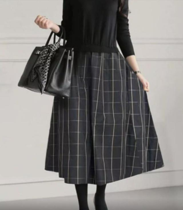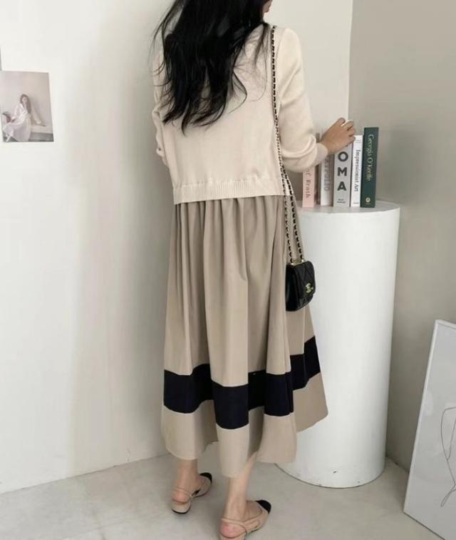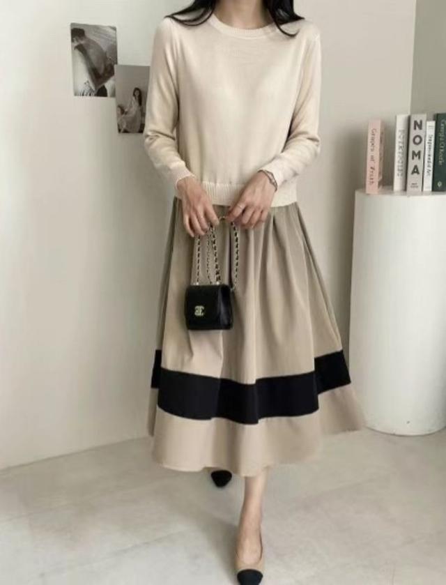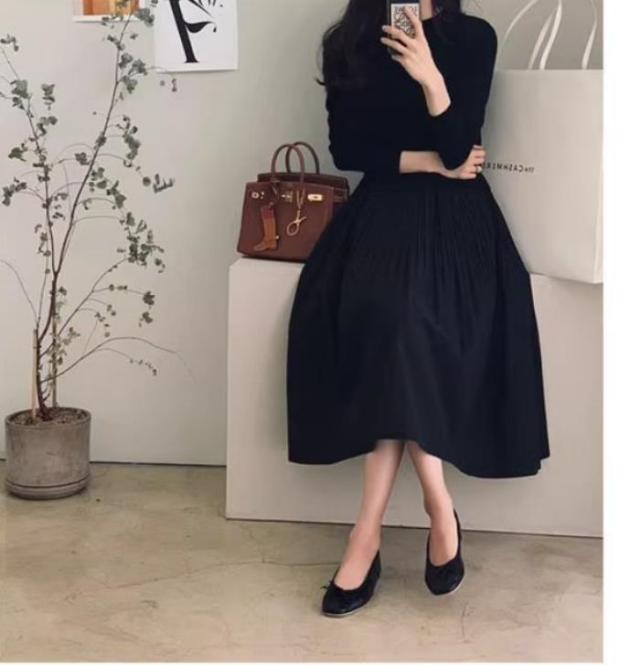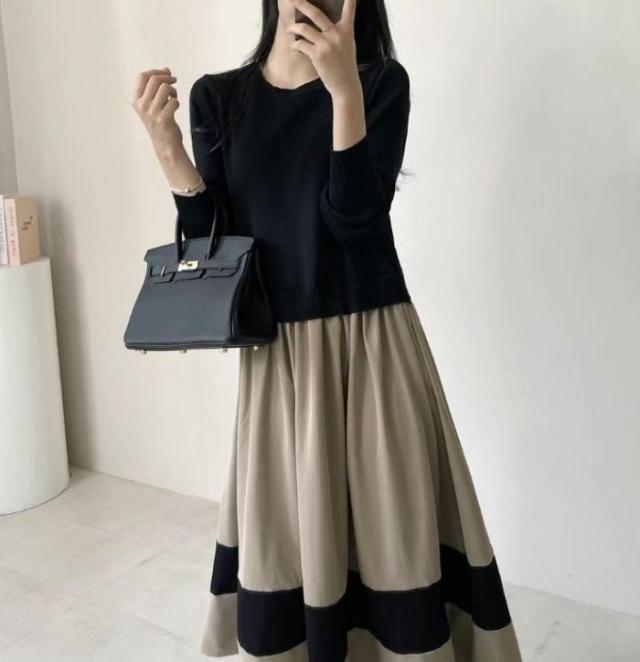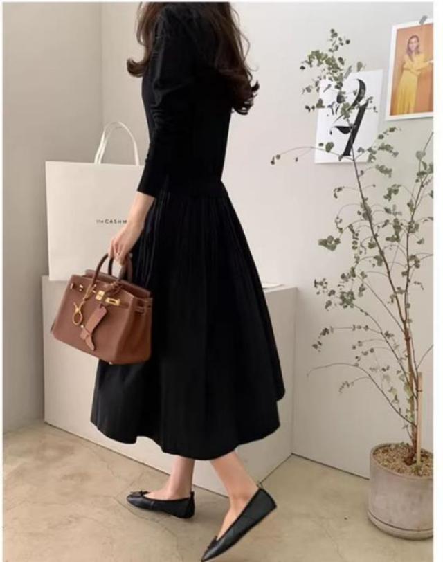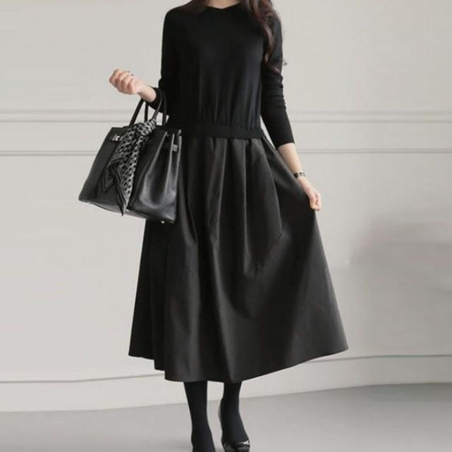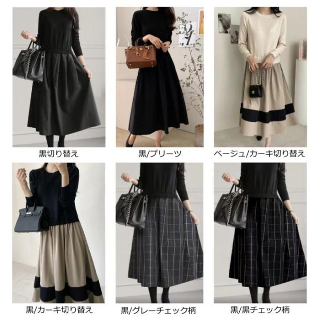 黒ワンピース ロングワンピース ニット 切り替え レディース 長袖 春 ロング丈 プリーツ 秋冬