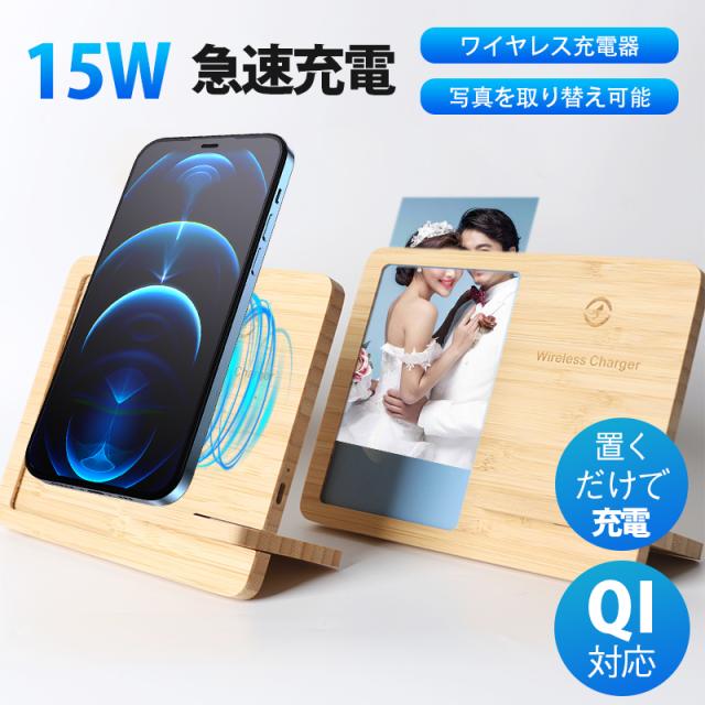 ワイヤレス充電器 木製 フォトフレーム 15w 竹製 iPhone Andriod 置くだけ 充電スタンド 充電器 ワイヤレスチャ