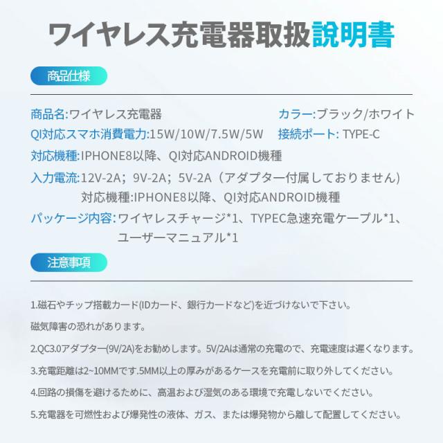 「15W高速充電」、「置くだけ充電」、「ケースをつけたままで充電」、Qi規格準拠のワイヤレス充電器。