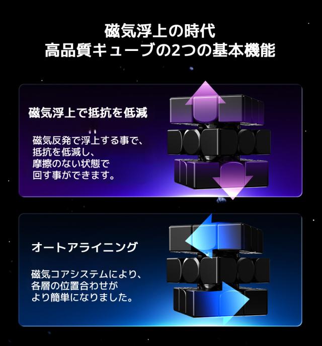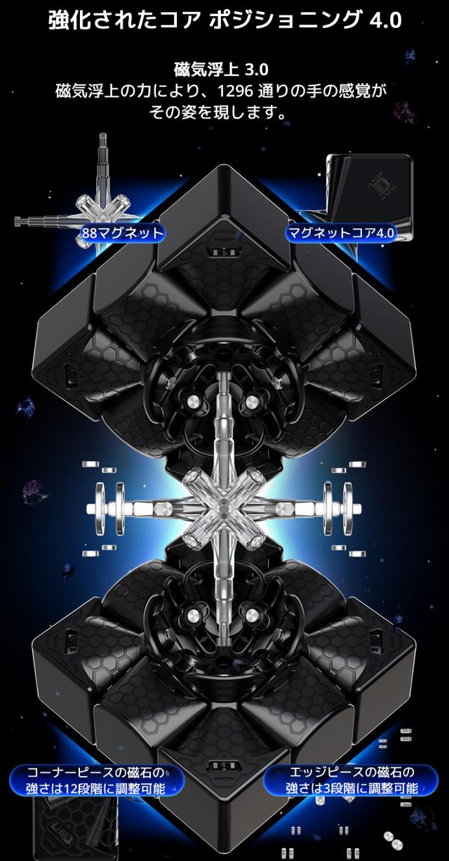 88個の磁石の吸引力で反発力のハイブリッド駆動により吸引により素早く回転、磁気浮上の反発による抵抗減により非常に快適な回し心地を実現しました。