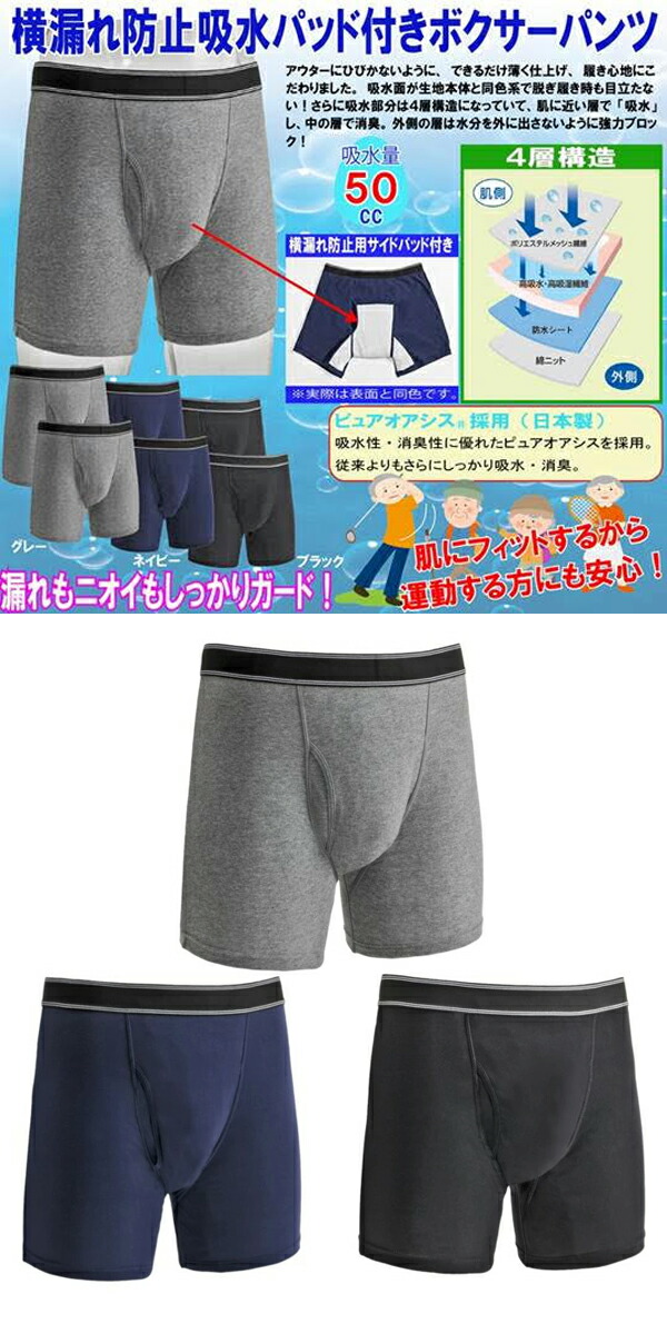 横漏れ防止吸水パッド付ボクサーパンツ 3枚組 失禁 尿漏れ 男性用