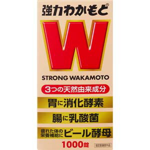 |商品概要メーカー:わかもと製薬商品名:強力わかもと(1000錠)区分:医薬部外品内容量:1000錠商品概要:【指定医薬部外品】胃腸からいきいきと♪JANコード:4987243114373商品コード:104300915商品の特徴強力わかもとがあなたの胃腸と健康をサポート・腸内環境を整え、腸からきれいに。・気になるお腹の張りをからだの内側から改善。・90年以上の研究を基に消化・整腸・栄養補給の3つの働きを持つ。・便通を促しおなかの調子を整える。・からだの疲れが気になるあなたに。・家族の健康が気になるあなたに。効能・効果胃もたれ、食欲不振、消化不良、消化不良による胃部・腹部膨満感、食べ過ぎ、胸つかえ、消化促進整腸(便通を整える)、軟便、便秘、腹部膨満感滋養強壮、虚弱体質、肉体疲労・病中病後・胃腸障害・栄養障害・発熱性消耗性疾患・産前産後などの場合の栄養補給用法・用量1日3回、朝昼夕食後に服用してください。原材料/成分/素材/材質【成人1日量(27錠)あたり】アスペルギルス・オリゼーNK菌、(消化酵素産生菌)培養末「小麦を含む」:3375.0mg、乳酸菌培養末「小麦を含む」:675.0mg、乾燥酵母(ビール酵母):2490.1mg、チアミン硝化物(ビタミンB?):3.4mg、リボフラビン(ビタミンB?):2.0mg、ニコチン酸アミド:2.0mg本剤は天然由来の原料を使用しておりますので、色・におい・味に多少の変動がある場合もありますが、服用に差し支えありません。本剤は小麦由来成分を含んでおります。保存方法●直射日光の当たらない湿気の少ない涼しい所に、密栓して保管してください。なお、瓶入り製品については橙色のキャップで密栓して保管してください。分包品については、1包を分割して服用した残りは、袋の口を折り返して保管してください。●小児の手のとどかない所に保管してください。●他の容器に入れ替えないでください。(誤用の原因になったり、品質が変わります。)●瓶の橙色のキャップのしめ方が不十分な場合、湿気などの影響で薬が変質することがありますので、服用のつど橙色のキャップをよくしめてください。また、ぬれた手で扱わないでください。●使用期限を過ぎた製品は服用しないでください。●一度開封した後は、品質保持の点から用法・用量どおりになるべく早く服用してください。特に分包品については、品質保持の点から用法・用量どおりに2日以内に服用しください。使用上の注意●次の人は服用前に医師又は薬剤師に相談すること。(1)医師の治療を受けている人。(2)本人又は家族がアレルギー体質の人。(3)薬によりアレルギー症状を起こしたことがある人。●次の場合は、直ちに服用を中止し、医師又は薬剤師に相談してください。(1)服用後、次の症状があらわれた場合関係部位/皮膚症状/発疹・発赤、かゆみ(2)1カ月位服用しても症状がよくならない場合お問い合わせ先わかもと製薬 お客様相談室03-3279-1221受付時間 9:00〜17:30(土、日、祝日および当社指定定休日を除く)