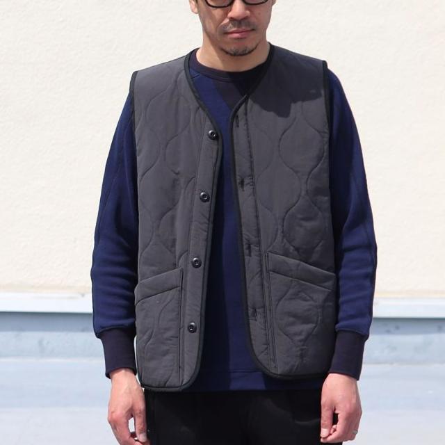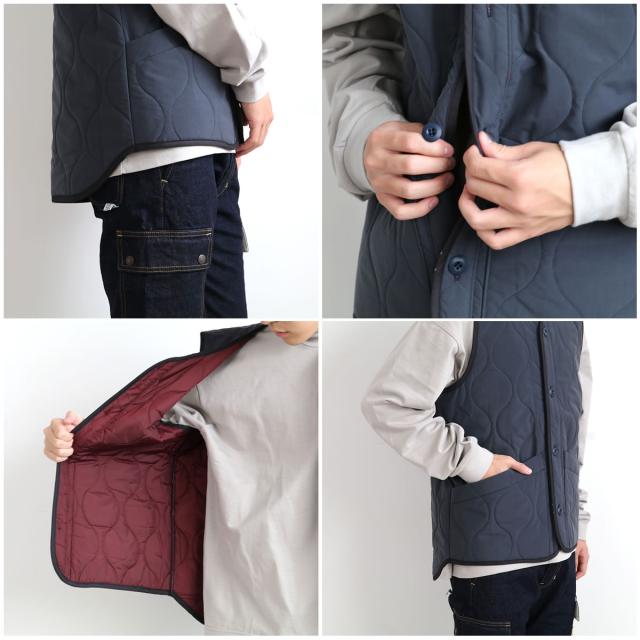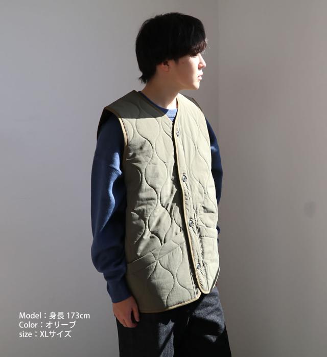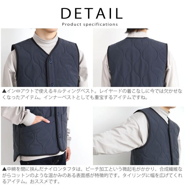 ■ Audience オーディエンス 商品詳細 軽量かつ防寒性のあるキルティングベスト Teflon(テフロン)耐水撥水コットンタッチナイロン ウェーブキルト Vネック ベスト 【イン アウトで使えるキルティングベスト】 独特な表情を持つウェービングキルトのベスト。 レイヤードの着こなしに今では欠かせなくなったアイテム。インナーベストとしても重宝するアイテムですね。 Audienceでも毎シーズンご提案させて頂いているキルティングベストですが、今作はサイズ感の微修正に着丈の仕様をアップグレード。 後ろ身頃をラウンド仕様に変更し、腰あたりまでの長さに設定しました。 中綿を間に挟んだナイロンタフタは、ピーチ加工という微起毛がかかり、合成繊維ながらコットンのような温かみのある表面感が特徴的です。 キルティングベストは、ミリタリーの世界でも各国で、それぞれに合わせたデザインで幅広く愛されるアイテムの一つではないでしょうか。 Audienceではウェーブキルトを用いているので、どちらかと言えば、US ARMYの匂いがしますね。 スタイリングに幅を広げてくれるアイテム。おススメです。 |