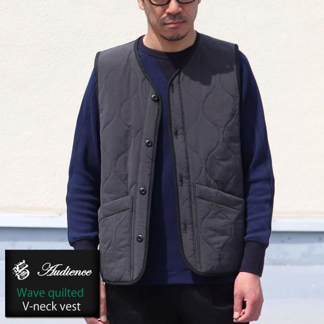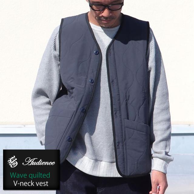アウター オーディエンス Audience テフロン ウェーブキルト Vネック ベスト ( aud7201 ) ジャケット 耐水撥水コットンタッチナイロン チョッキ ジレ ワイドシルエット 日本製 メイドインジャパン リラックス 大人カジュアル 無地 キレイめ モード メンズ おしゃれ アーベン