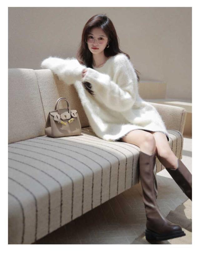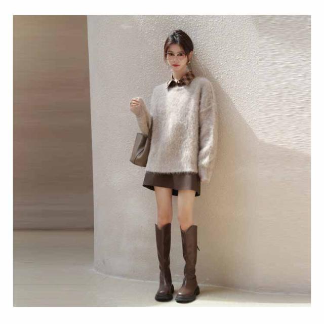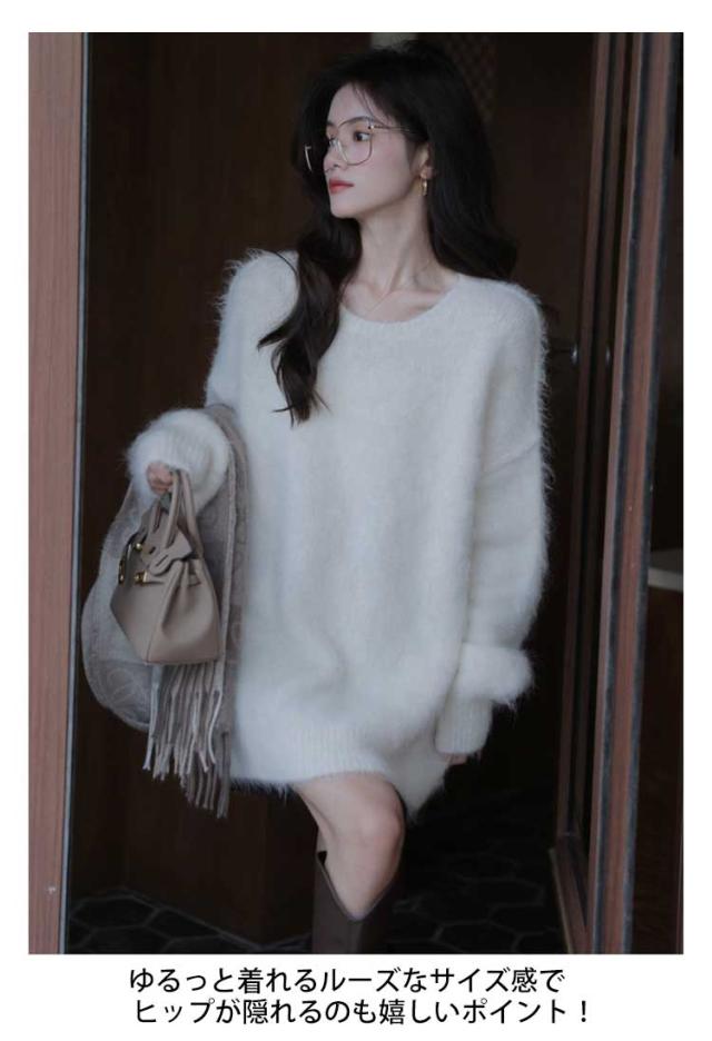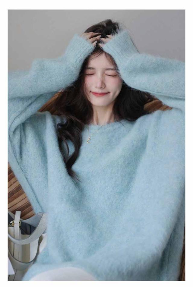 ニット レディース 秋冬 ふわふわ トップス プルオーバー セーター シャギーニット フェザーヤーン 大きいサイズ オーバーサイズ Uネック 柔らかい ブルー 水色 ホワイト 白 もこもこ ゆったり カジュアル ラウンドネック シャギー フェザー