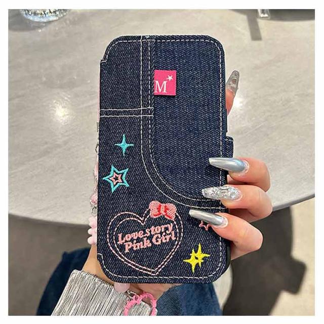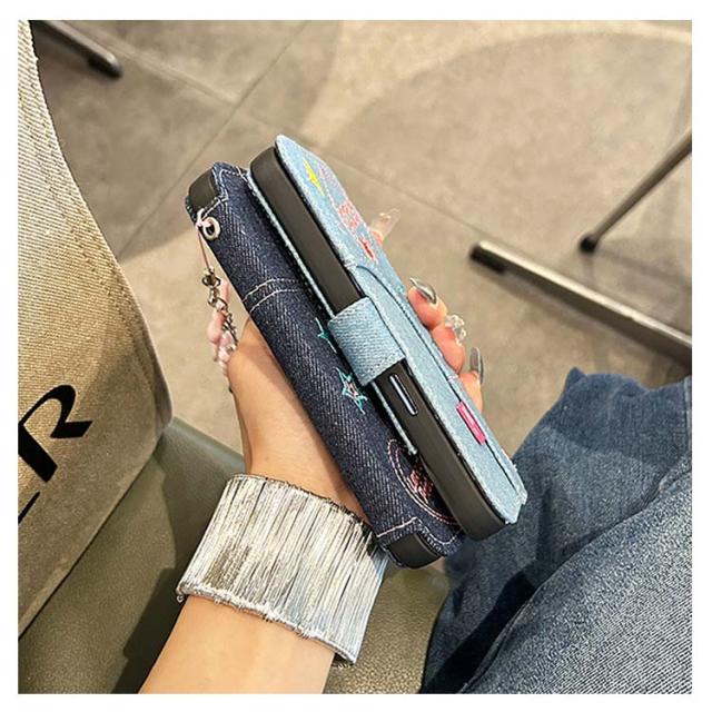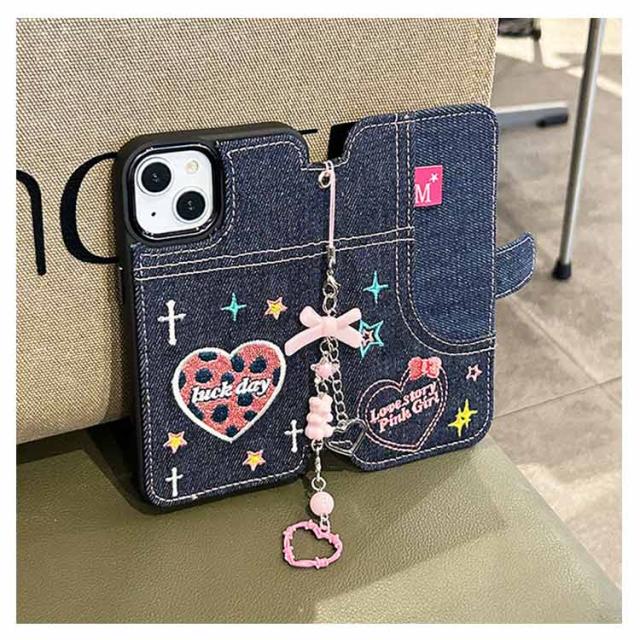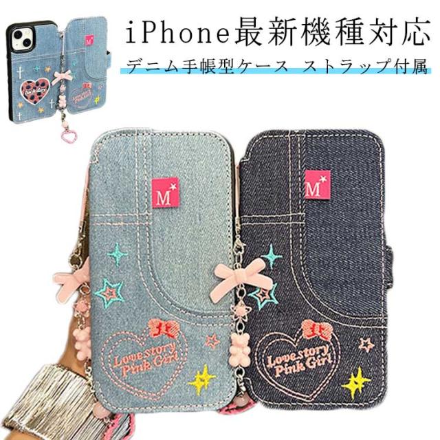 ストラップ付き 刺繍 リボン iPhone15 ケース デニム スマホケース iPhoneケース 手帳型ケース 手帳型 スマホケース デニム ケース カバー 衝撃保護