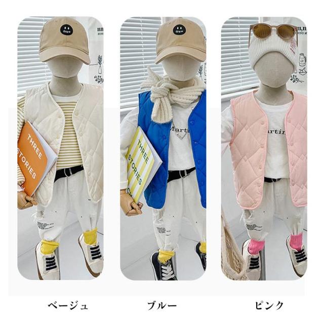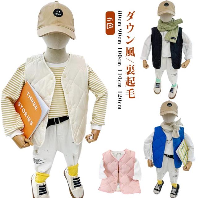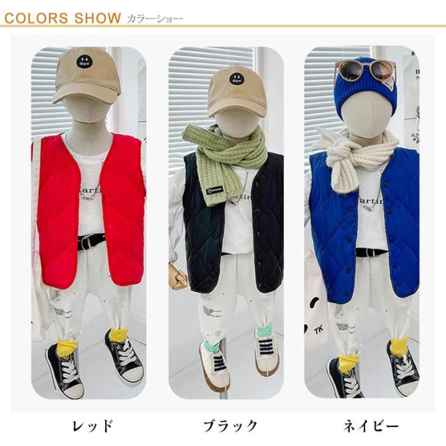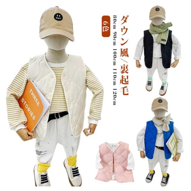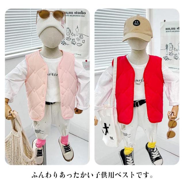 送料無料 ベスト ダウン風 中綿ベスト 裏起毛 ジャンパー ジャケット 中綿入り ベビー 子供 男の子 女の子 アウター 上着 袖なし 前スナップボタン 前開き ジャケット 防寒 暖かい あったか もこもこ 無地 単色 シンプル カジュアル お洒落 かわいい