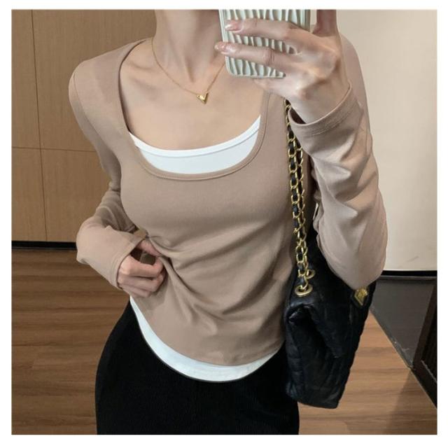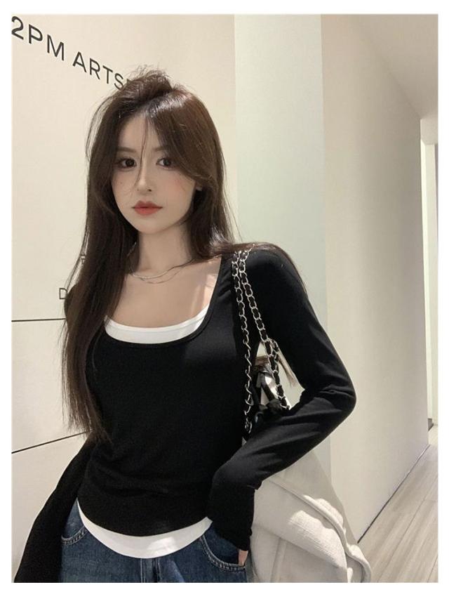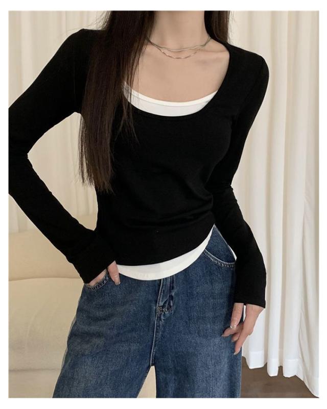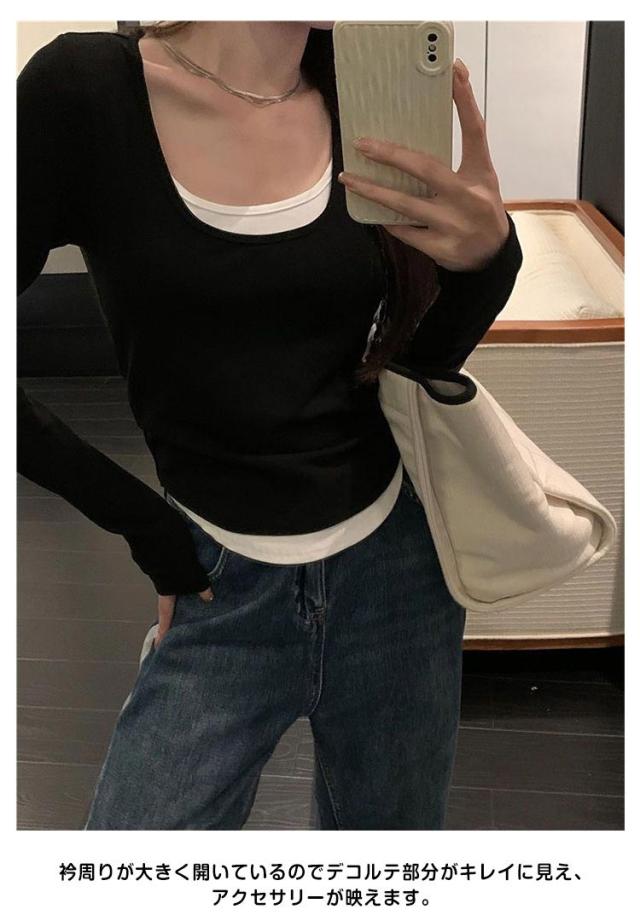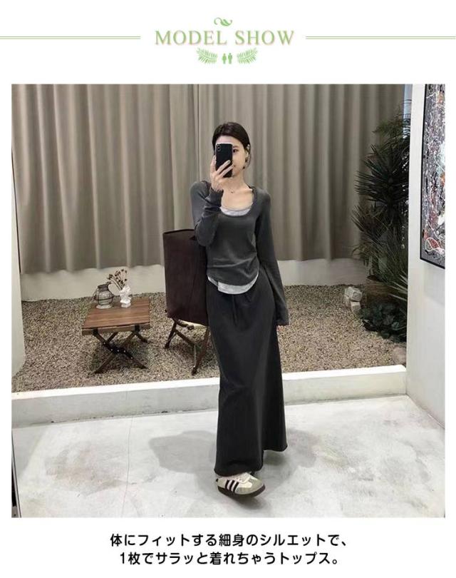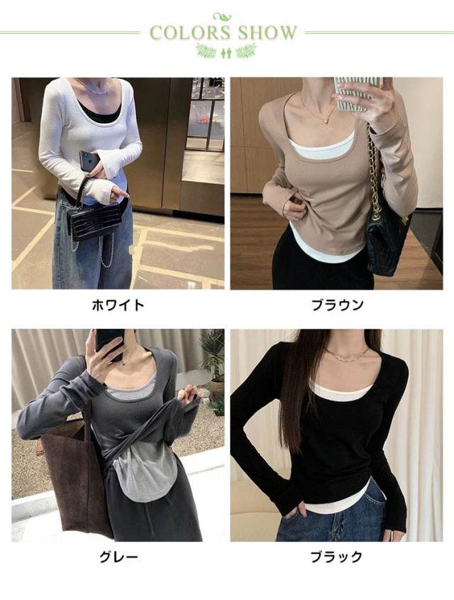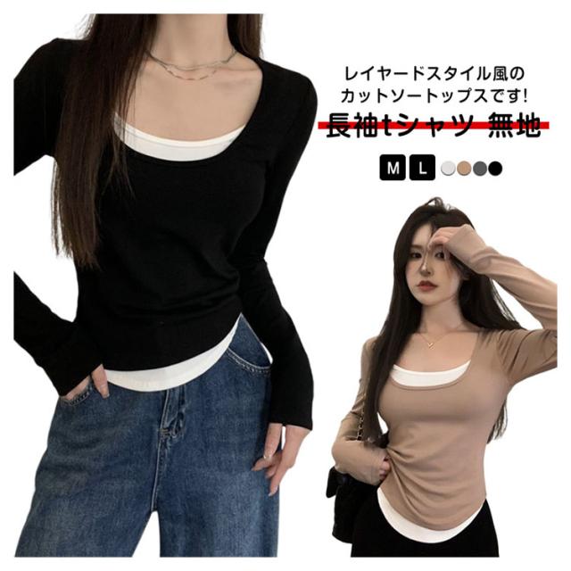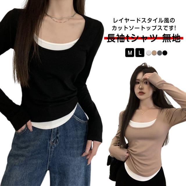 レイヤード風カットソートップス tシャツ 長袖 レディース ロングトップス ロングtシャツ 長袖tシャツ 無地 秋 春 冬 クルーネック カットソー トップス レイヤード 【レイヤード風の裾デザイン】