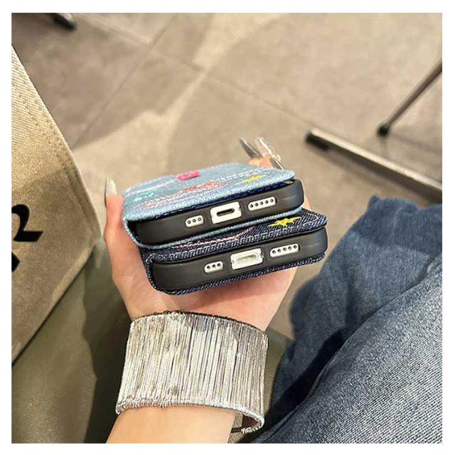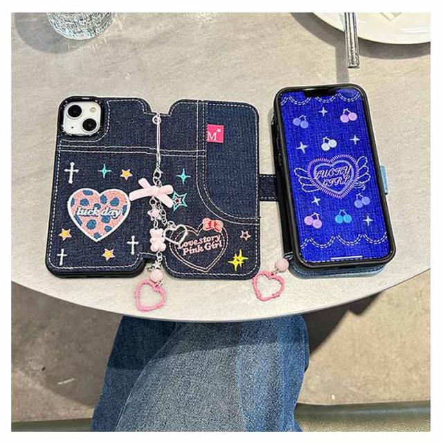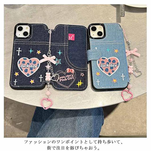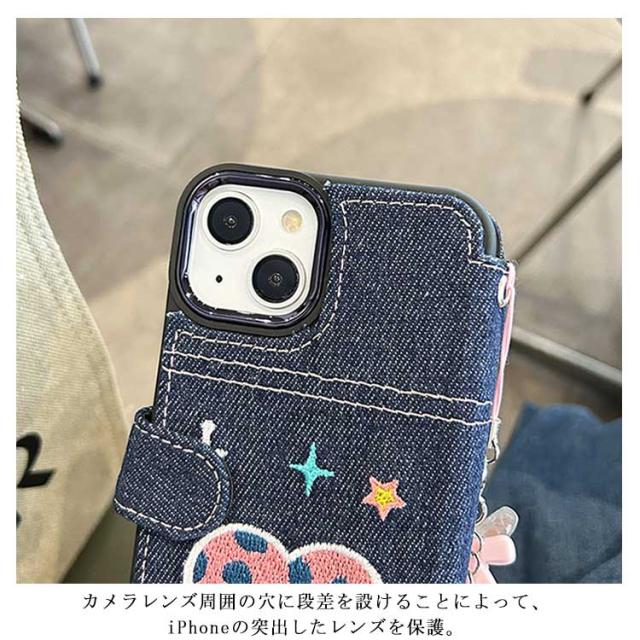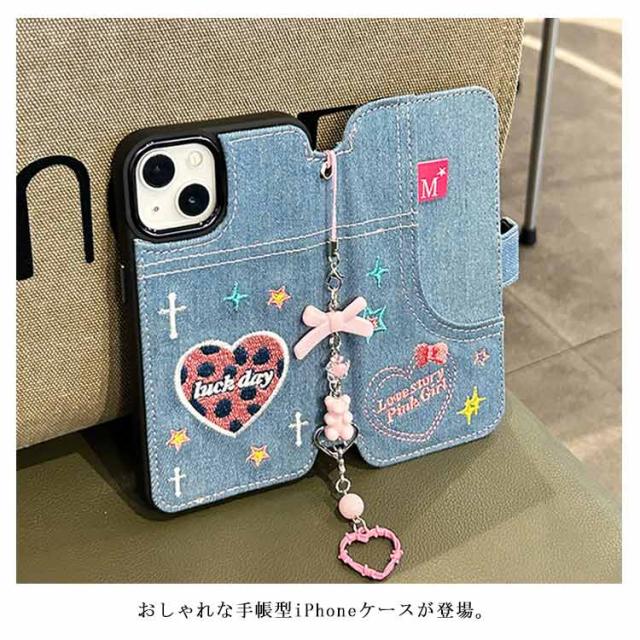 ストラップ付き 刺繍 リボン iPhone15 ケース デニム スマホケース iPhoneケース 手帳型ケース 手帳型 スマホケース デニム ケース カバー 衝撃保護