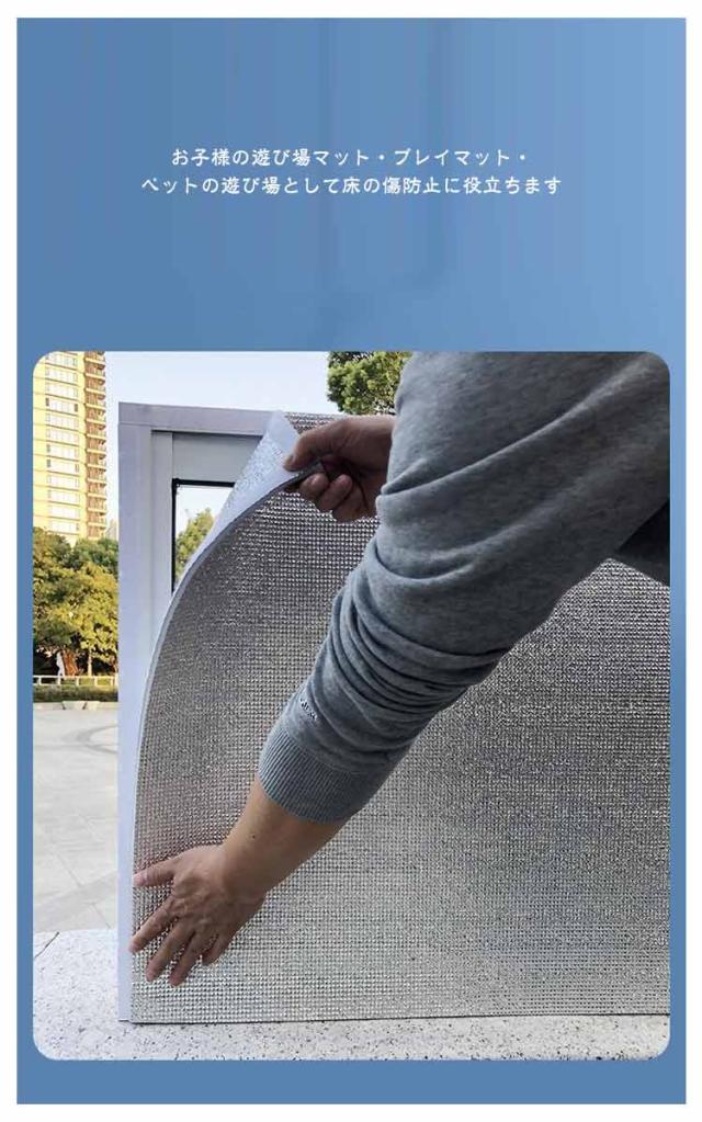 | エアコンの効率を高めて夏は涼しく冬は暖かい、断熱シートのアルミタイプ。 両面アルミ蒸着なので、内側・外側の両面で熱を反射。 高い遮熱効果を発揮します。 快適なクッション性と保温力、強力な防音効果を発揮します。 夏は遮熱・断熱・保冷効果で温度上昇を抑え、冬は冷気を遮って保温効果を高めます。 ハサミやカッターでお好きなサイズ・形にカットしてご利用いただけます。 お子様の遊び場マット・プレイマット・ペットの遊び場として床の傷防止に役立ちます。 | |