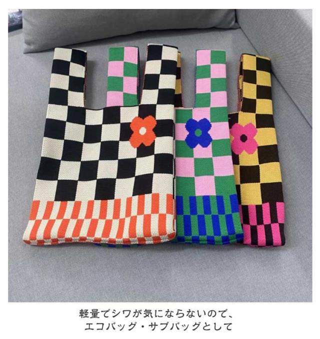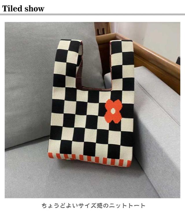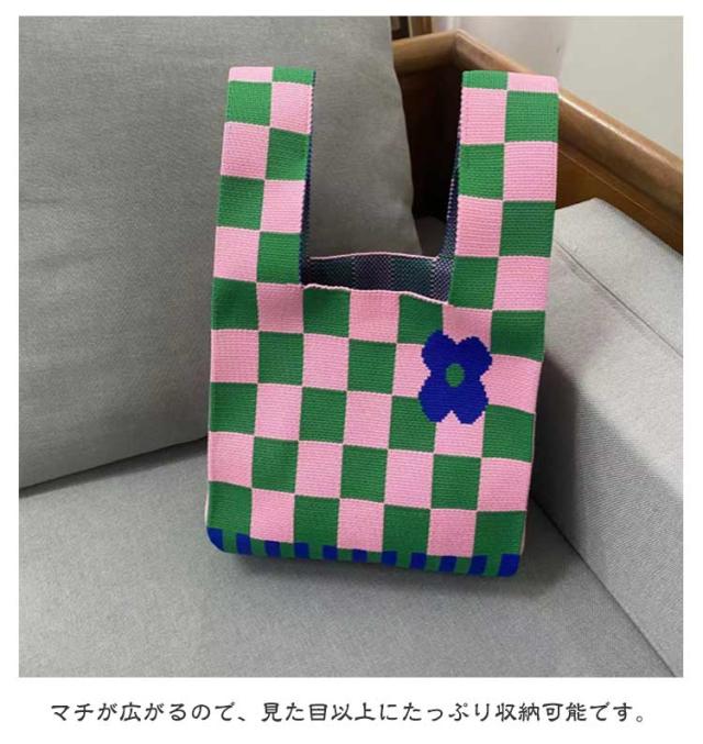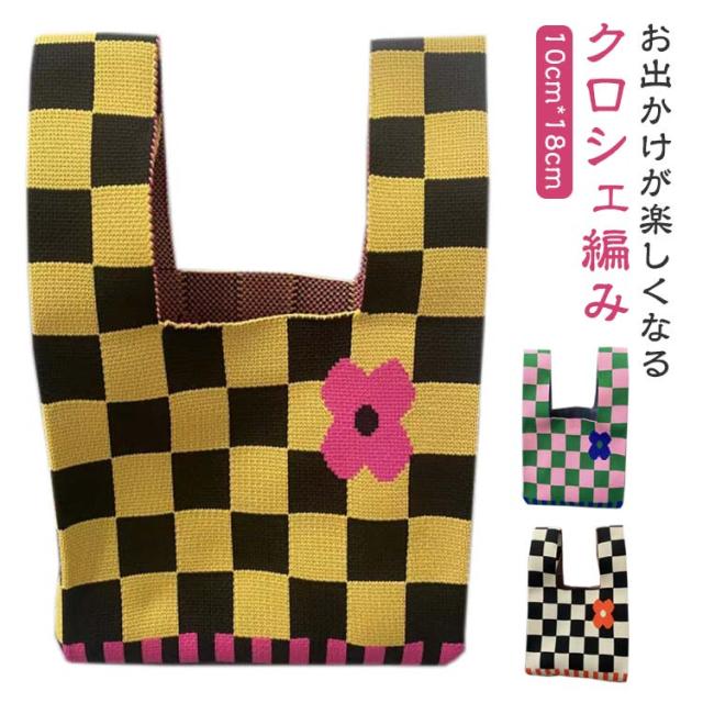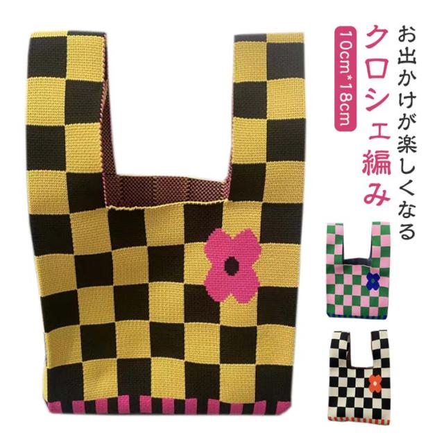 ニットバッグ トートバッグ レディース ミニニットバッグ マルシェバッグ ニット 縦型 かばん 鞄 小さめ エコバック サブバッグ クロシェ編み ハンドバッグ チェック柄 おしゃれ かわいい 韓国 送料無料