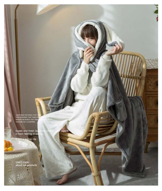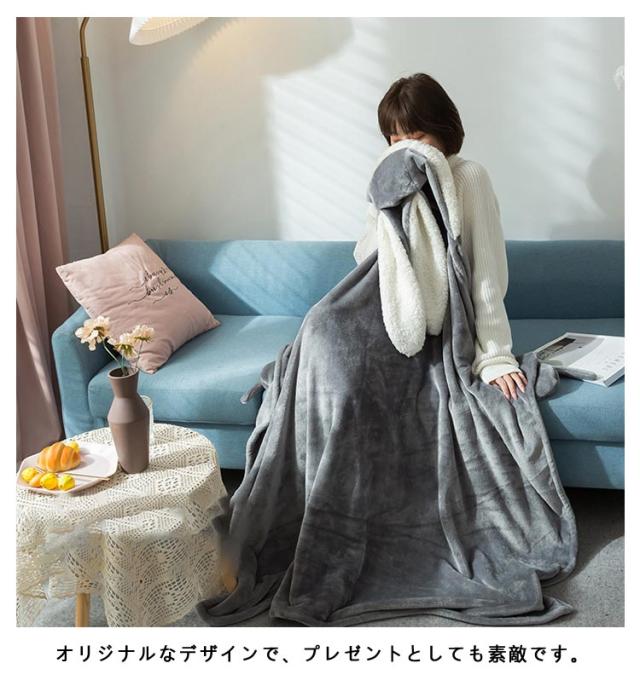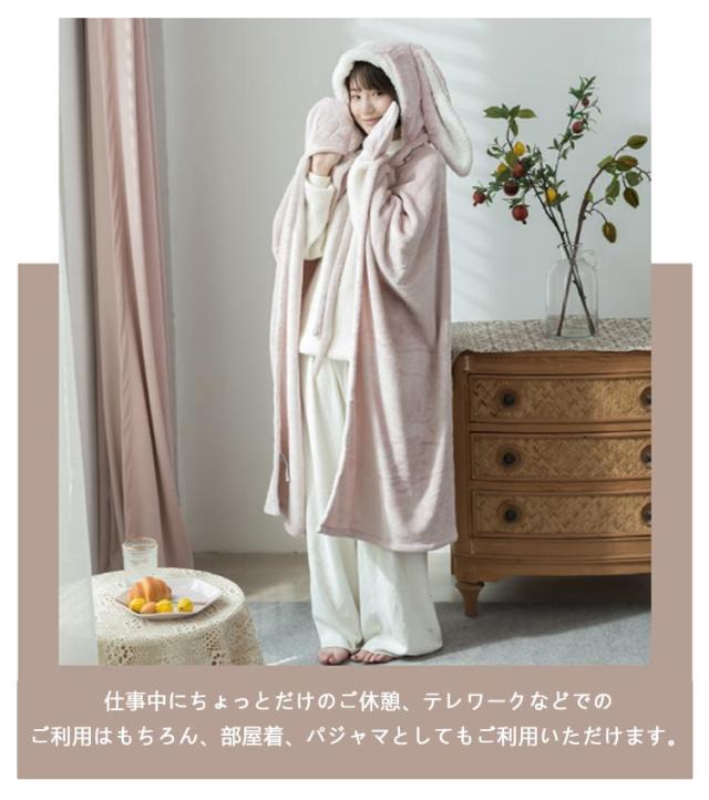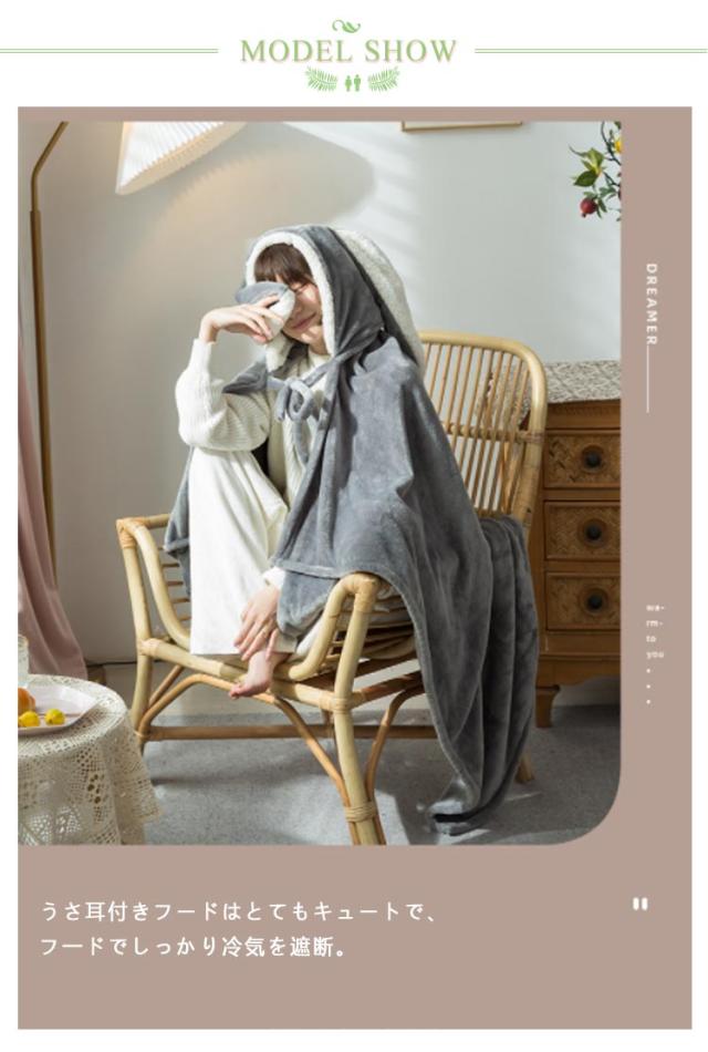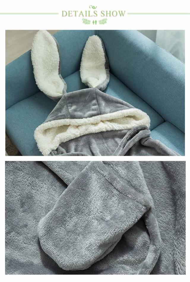 | ウサギ耳付き、可愛いポンチョブランケット。 毛布のような厚手のフランネル生地を使用しています。 ふわふわ、もこもこ、柔らかい着心地で肌触りが良い。 保温性も高いので、寒くなり始めた秋・冬におすすめです。 うさ耳付きフードはとてもキュートで、フ一ドでしっかり冷気を遮断。 ボタン付きで、普通のパジャマとしてもご利用いただけます。 仕事中にちょっとだけのご休憩、テレワークなどでのご利用はもちろん、部屋着、パジャマとしてもご利用いただけます。 オリジナルなデザインで、プレゼントとしても素敵です。 | |