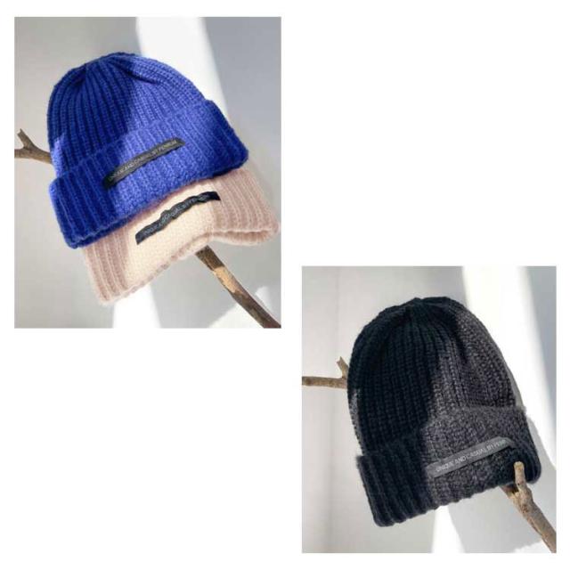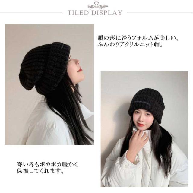 | 寒さ対策ばっちり、しっかり厚みのニット帽。 頭の形に沿うフォルムが美しい。ふんわりアクリルニット帽。 伸縮性がしっかりあるので性別を問わずお使いいただけます。 寒い冬もポカポカ暖かく保温してくれます。 | |