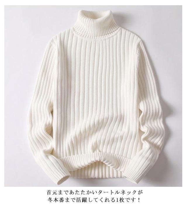 | シンプルで着まわしやすい、タートルネックリブ編みニットセーターの登場。 柔らかく伸縮性のあるリブニット素材だから、体のラインに優しくフィット。 首元まであたたかいタートルネックが冬本番まで活躍してくれる1枚です! ナチュラルの綿素材で、柔らかい肌触りが魅力。 トップスのメインにも、ジャケットやブルゾンのインナーにレイヤードでも魅力を発揮してくれます。 | |