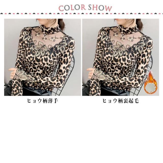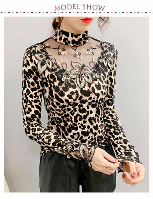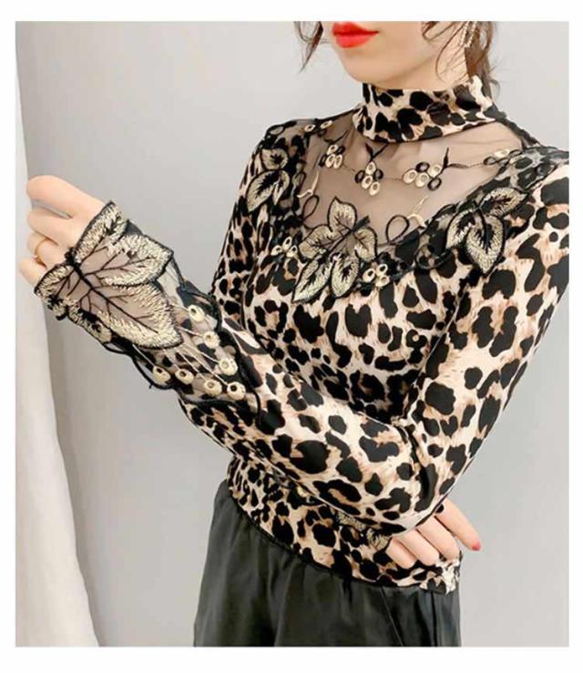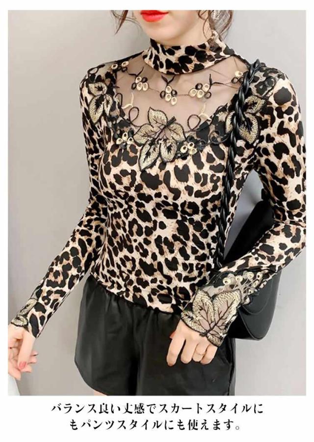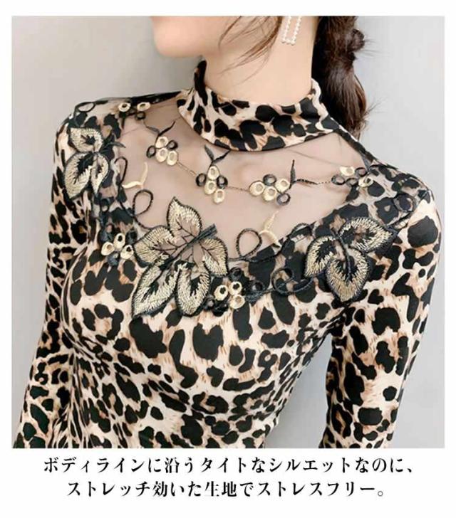ヒョウ柄 tシャツ インナー シースルー 無地 カットソー ストレッチ素材 透け感 レディース 秋冬 トップス 長袖 豹柄 大人 トップス