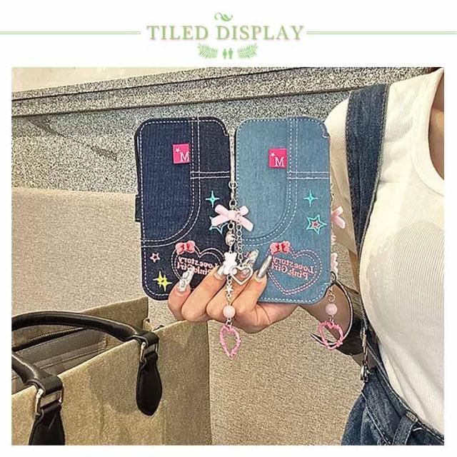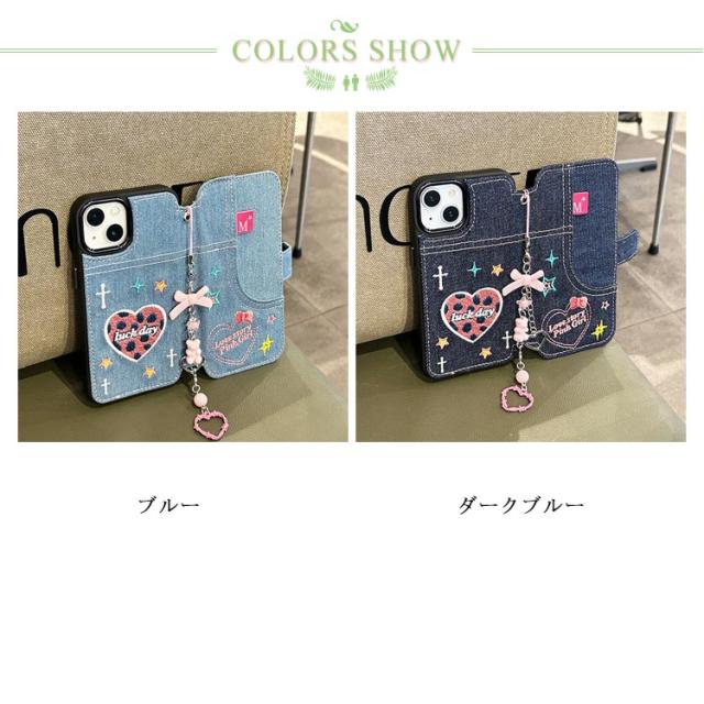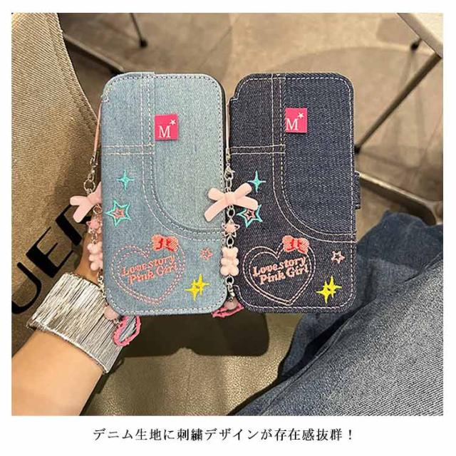 ストラップ付き 刺繍 リボン iPhone15 ケース デニム スマホケース iPhoneケース 手帳型ケース 手帳型 スマホケース デニム ケース カバー 衝撃保護