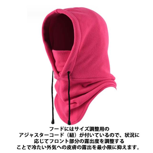| 【フードウォーマー】【男女兼用】【12color】 ネックウォーマー、フェイスマスク、目出し帽として、3WAYの防寒対策が出来るフリース素材のフード付きネックウォーマーです。 着脱しやすいように通常のフード付きネックウォーマーより大きめのフードを採用。 更にネック部分は丈を長くすることで首元からの冷気の侵入を抑え、高い防寒性をキープします。 フードにはサイズ調整用のアジャスターコード(紐)が付いているので、状況に応じてフロント部分の露出度を調整することで冷たい外気への皮膚の露出を最小限に抑えます。 スキー・スノーボード・バイク・ツーリング・自転車・サイクリング・トレッキング・アウトドア・登山・釣り・旅行・通勤・通学など様々なシーンでご利用頂けます。 | |