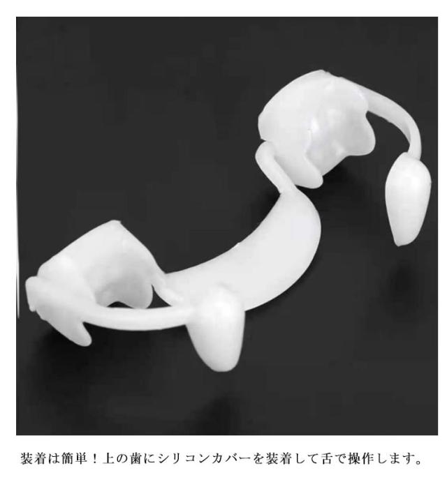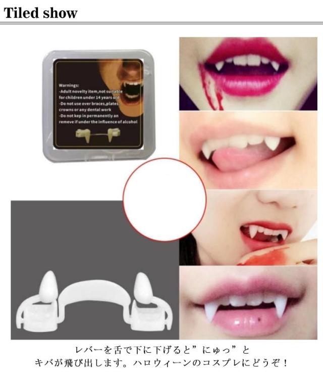 | 付けるだけでお手軽に定番の吸血鬼の様な口元を再現できる仮装おもしろグッズです。 装着は簡単!上の歯にシリコンカバーを装着して舌で操作します。 レバーを舌で下に下げると”にゅっ”とキバが飛び出します。ハロウィーンのコスプレにどうぞ! コスプレ用の衣装などと合わせればより本格的に再現ができます。 | |