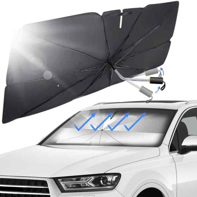 DEWEL サンシェード 車 フロント 傘型【360°中棒回転・強化10本骨】車サンシェード UVカット 遮光遮熱 軽自動車/普通車対応 折りたたみ式 収納ポーチ付き 車用サンシェード フロントガラス用 ドライブレコーダー対応 熱中症対策 (L(145*85CM))