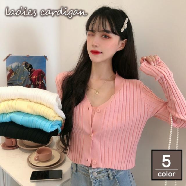 カーディガン ニット ショート丈 レディース 女性 トップス 長袖 前開き 前ボタン リブ 無地 シンプル スリム タイト Vネ
