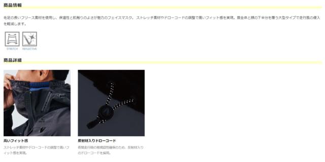 毛足の長いフリース素材を使用し、保温性と肌触りのよさが魅力のフェイスマスク。 ストレッチ素材やドローコードの調整で高いフィット感を実現。首全体と顔の下半分を覆う大型タイプで走行風の侵入を軽減します。