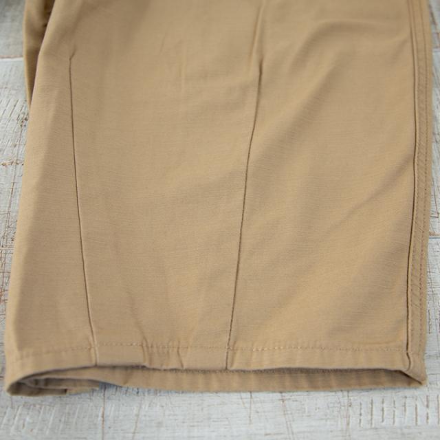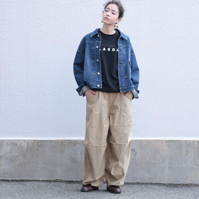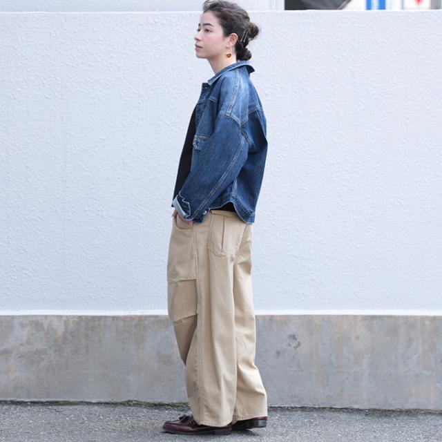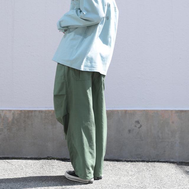 バルーンのようなかわいらしい丸みをもつシルエットがポイントの、アーミーパンツ。 程よいボリューム感と、あえてドライな質感に仕上げたムラ糸バックサテン素材。 |