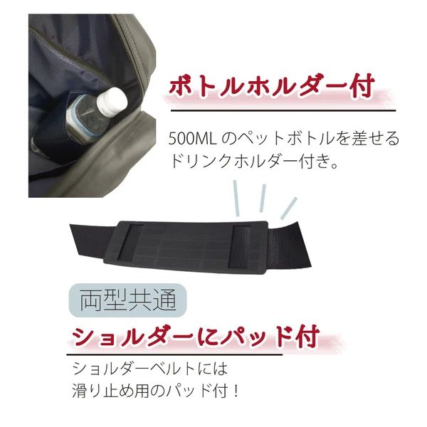 外出に必要な小物類を納められる内ポケット付き。ボトルホルダーに折り畳み傘を入れる使い方もオススメです