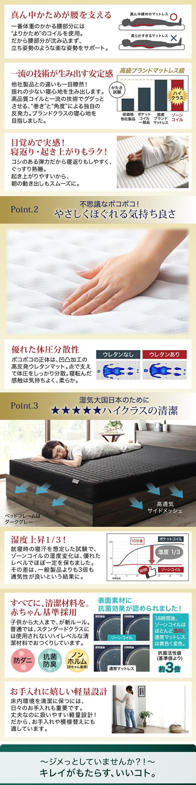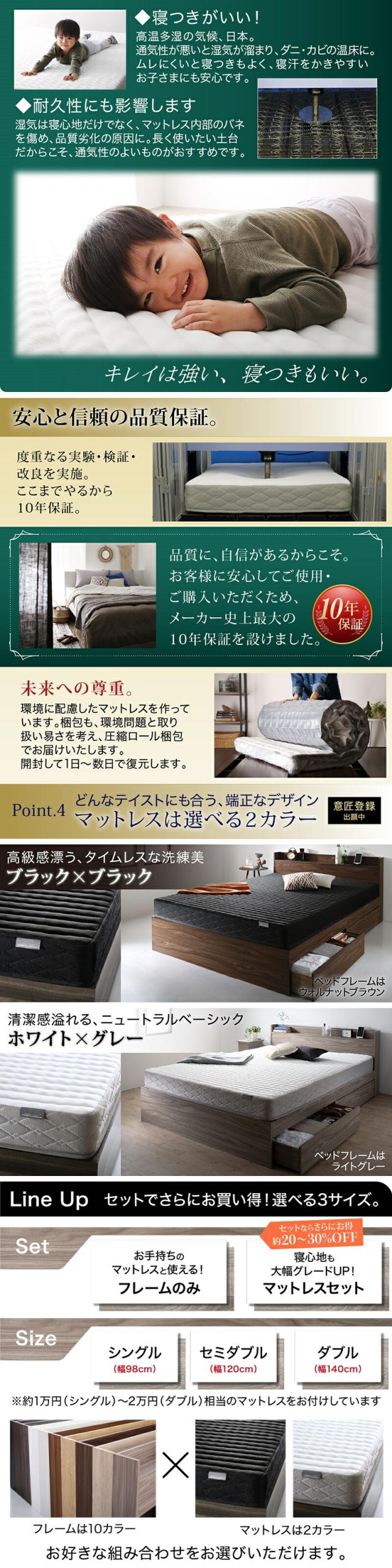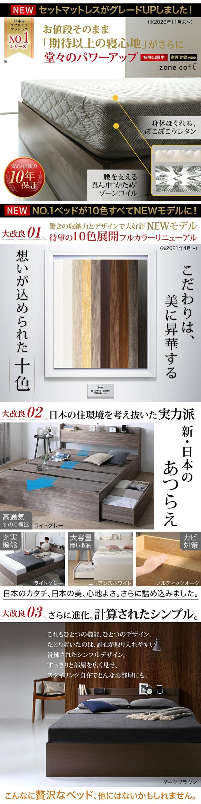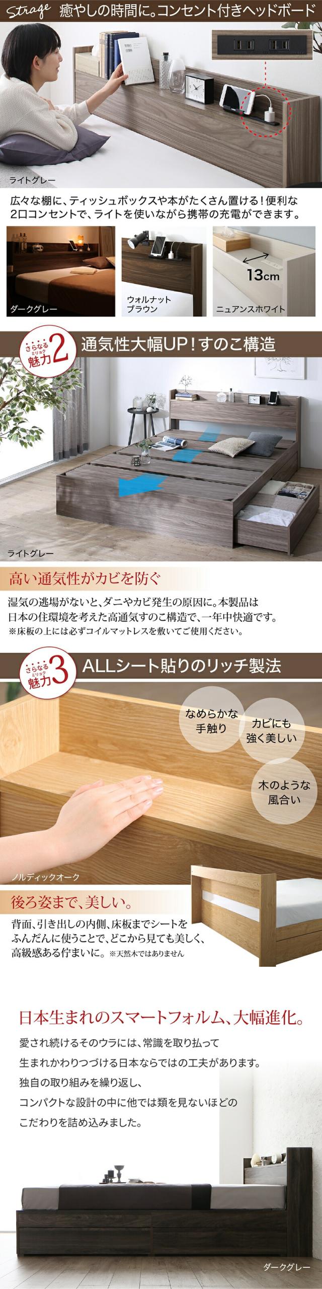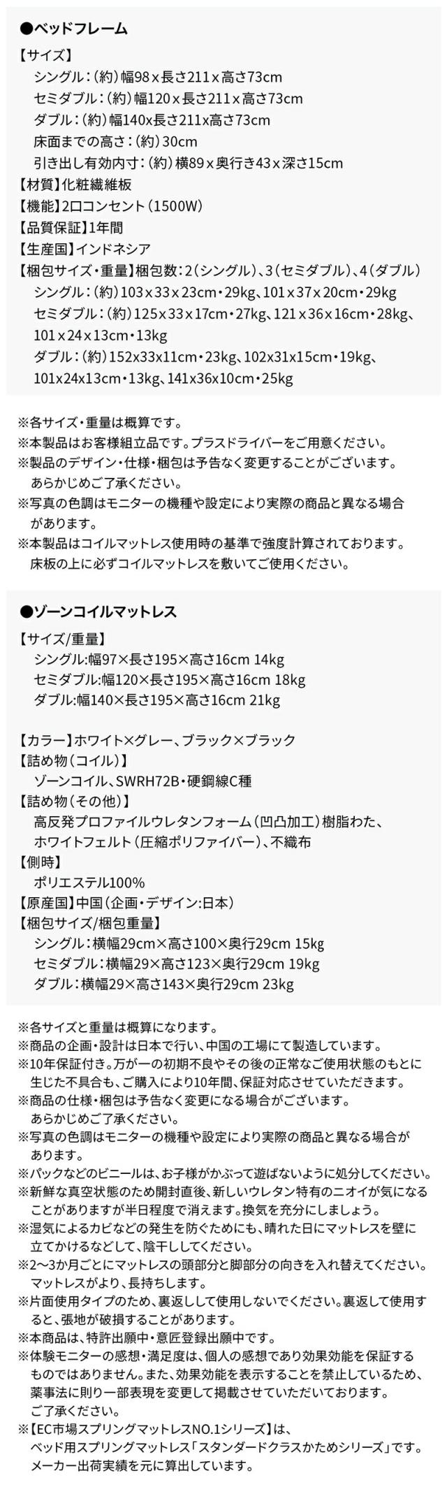 棚・コンセント付き 引き出し収納ベッド 〔エヴァーX〕 〔ゾーンコイルマットレス付き〕 シングル 〔フレーム色〕ライトグレー 〔マットレス色〕ホワイト 【北海道・沖縄・離島配送不可】