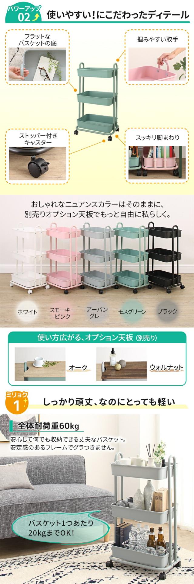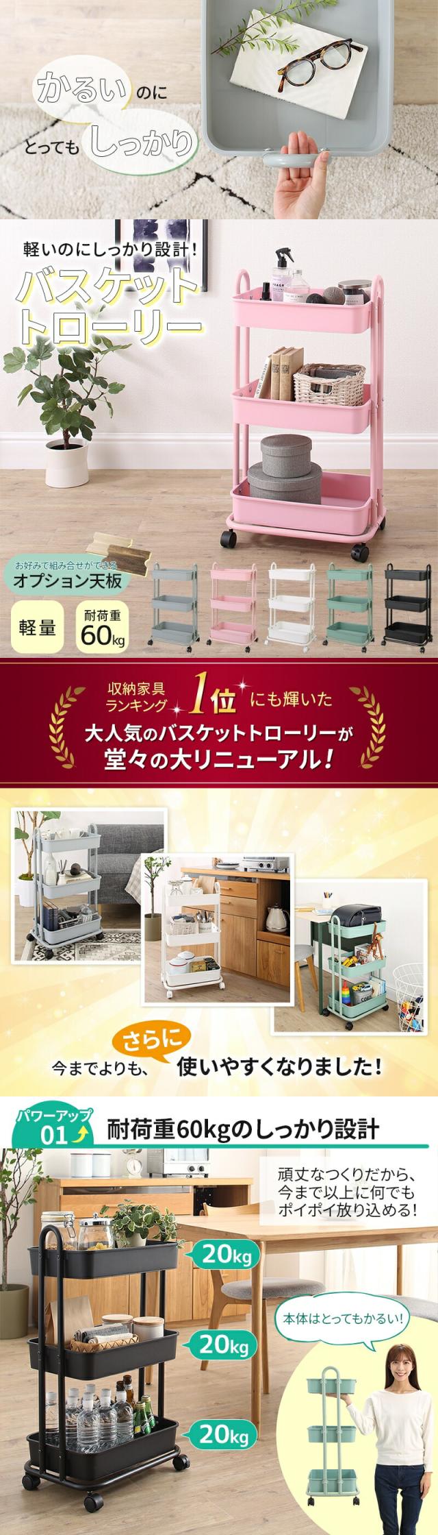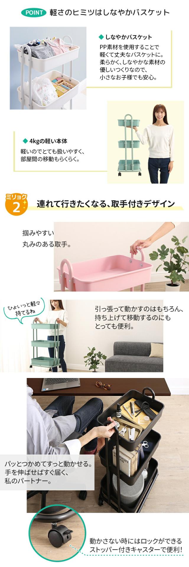安心して何でも収納ができるバスケットワゴンです。