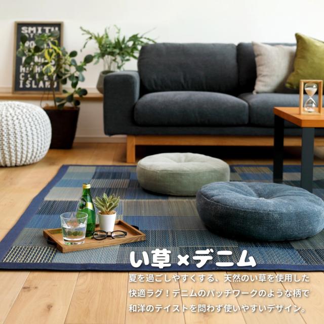 い草ラグ 〔デニムパッチ〕 はっ水機能付き 176×176cm ブルー 【北海道・沖縄・離島配送不可】