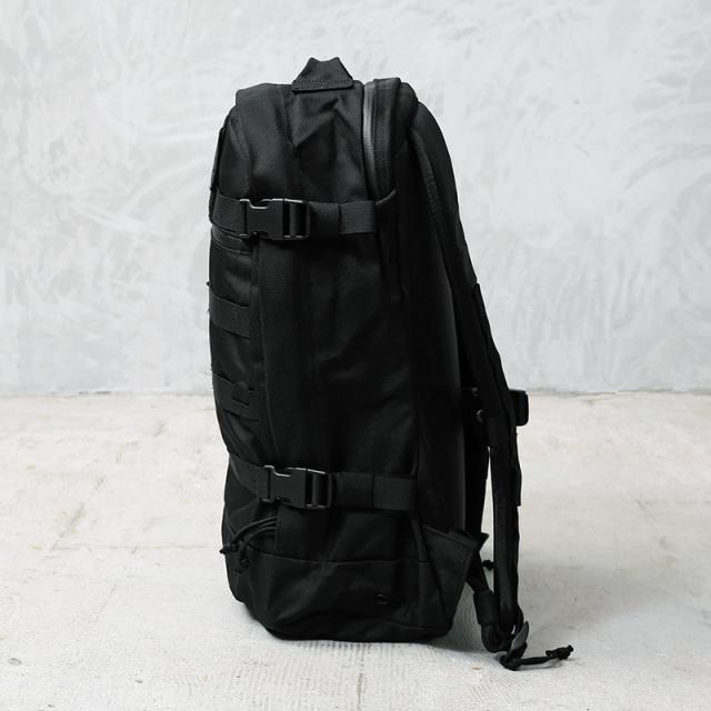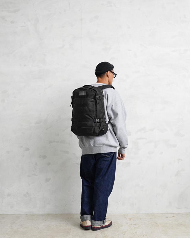 ミリタリーをコンセプトにしたSPEARシリーズのリファインモデル。止水ファスナーを使ったPCポケットやアクセサリー類の外付け装着可能なモーリーシステムなど、コンパクトながらミルスペックの基準を満たした機能を搭載しています。摩擦強度、引裂き強度、引張り強度などに優れ、非常に耐久性の高い『1680Dコーデュラバリスティックナイロン』を採用。 取り外し可能なロゴパッチは、オールブラックでより洗練され、幅広いシーンにマッチするデザインになっています。大型のメインコンパートメントを装備しており、荷物を乱雑に入れても中身が安定するように、クロスオーバーのサイドコンプレッションも設けられています。 また、トップにウェビングハンドルがあり持ち運びにも便利。背面側には、クッション性のあるPCやタブレット等の専用ポケットも備えています。