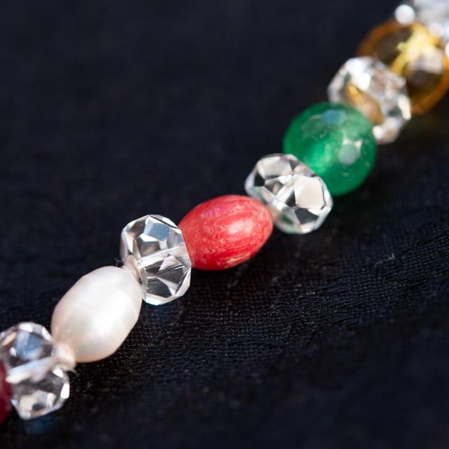 サンスクリット語で「9つの宝石」を意味する言葉、ナヴァラトナ。厳密に9つのジュエルを意味するというよりは富・地位・占星術の神秘と結び付けられて用いられる言葉です。パールやサンゴなど天然石や、イミテーションストーンで構成されています。