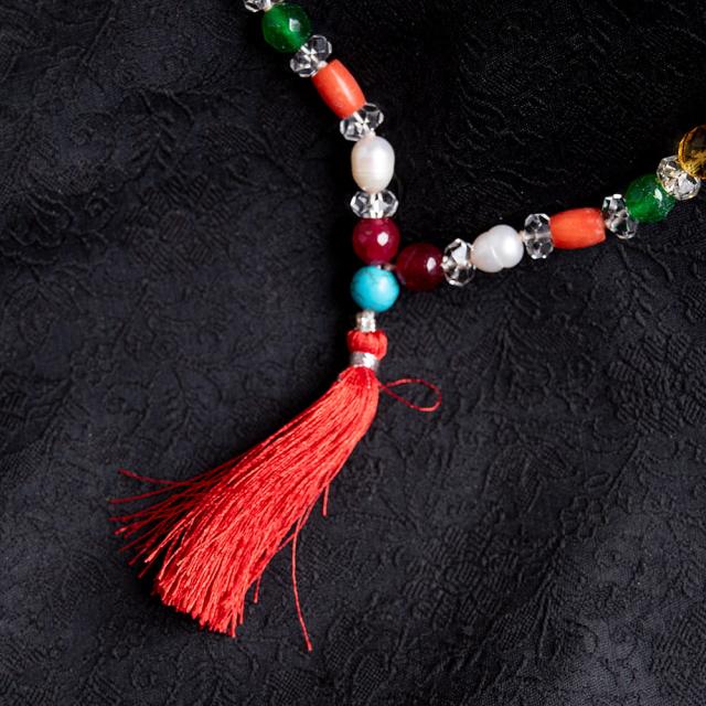 インドの数珠 - 天然石 ナヴァラトナ(9つの宝石)のネックレス 先端がフリンジ - 約32cm / 数珠、インドの数珠、ネックレス、首飾り、天然石、ナインストーン、ナワラトナ、ナワラトゥナ アクセ 【インドとアジアのアクセサリー