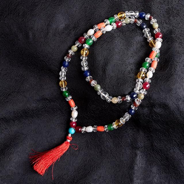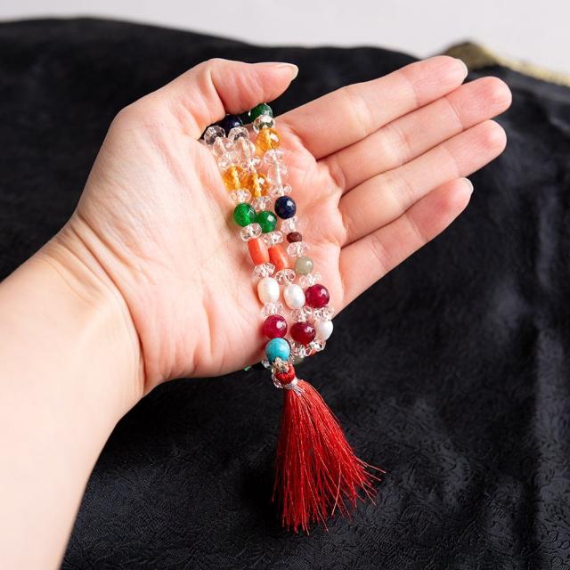 【送料無料】 インドの数珠 天然石 ナヴァラトナ(9つの宝石)のネックレス 先端がフリンジ 約32cm / 首飾り ナインストーン アジア エスニック アクセサリー アンクレット ピアス リング ビンディー