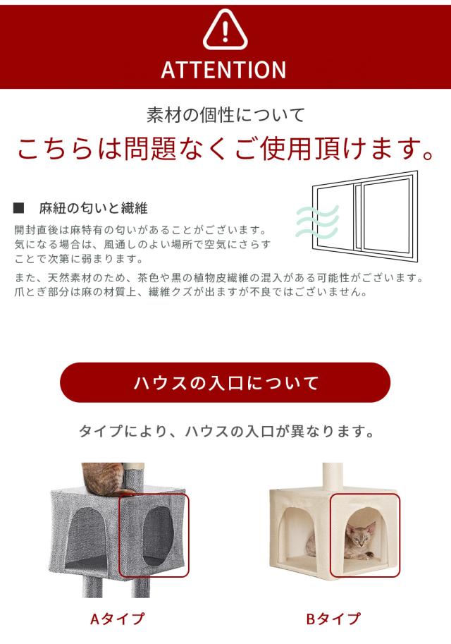 大人2人以上での組み立てをお勧めします。爪とぎ部分は麻の材質上、繊維クズが出ますが不良ではございません。部品の販売はしておりません。届いてしばらくは、接着剤や麻のにおいがすることがございますが、数週間程度換気をしていただきますと薄らいできます。色合いはモニター環境などにより実物とは多少異なる場合があります。手作業測定のため、サイズは誤差がある場合がございます。原材料具合、製造工場の変更等により予告なくデザイン、仕様などを変更する事がございます。