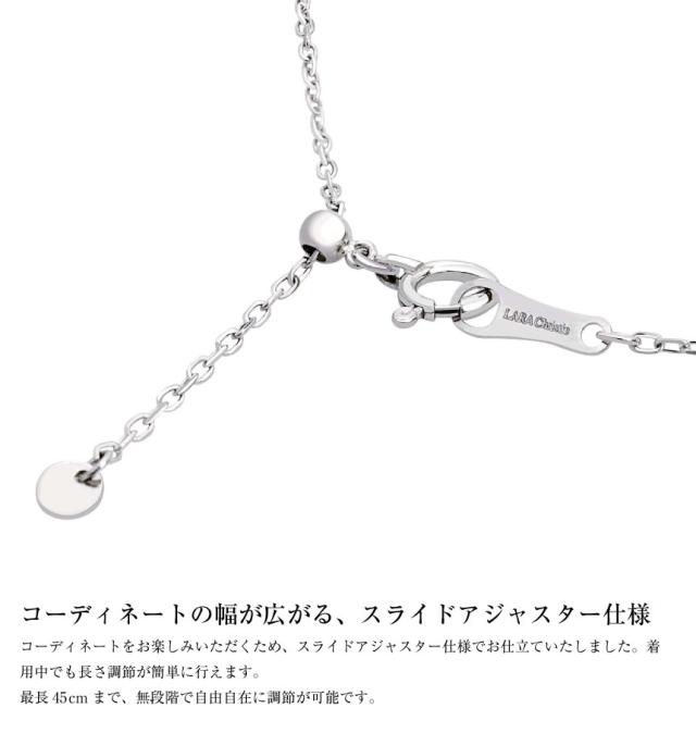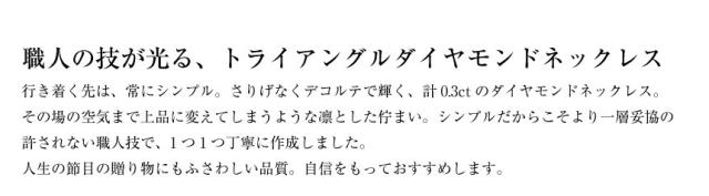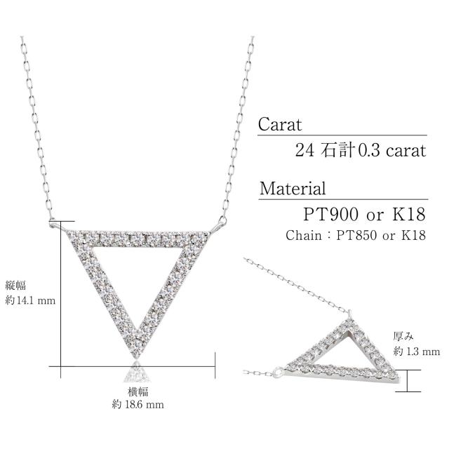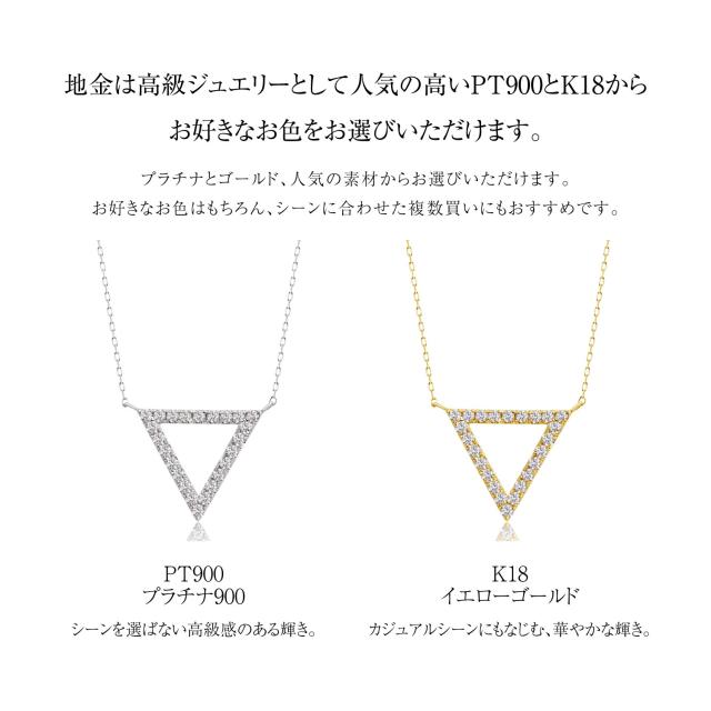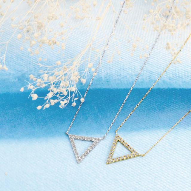 シンプルなトライアングルデザインに、ダイヤモンドが合計24石はめこまれた、上品なネックレス。フォーマルからカジュアルまで、アクセントとしてお楽しみいただけます。スライドアジャスター仕様となっているので、お好き長さでお楽しみいただけます。