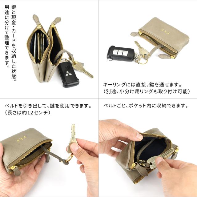表のキーケースは、中のべルト付きキーリングに鍵を取り付けて使います。ベルトは長さが12cmくらいあって、ファスナーを開いたままでも鍵を外に出してドアを開け閉めできます。袋状なので、車のスマートキーなどの大きな鍵でも収まりやすいのがポイント。そもそも、ポーチ型のキーケース自体がめずらしいのですが、鍵がすっぽり入ってジャラジャラと動きにくくなり、衣服のポケットやバッグの内側が鍵で傷まないのもいいところです。